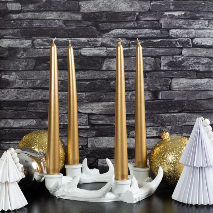 ¡Una decoración brillante para el Adviento! No siempre tiene que ser una corona en Adviento, las velas largas junto con las bolas plateadas y doradas crean un conjunto elegante para su decoración navideña. El ramo de amarilis rojas y ramas de pino doradas en una maceta aporta un bonito toque de color al fondo. Colócalo de forma informal sobre la mesa del salón o el aparador y conseguirás un centro de mesa muy llamativo, que combina a la perfección con los abetos blancos y las velas flotantes. ¡Compra este look!