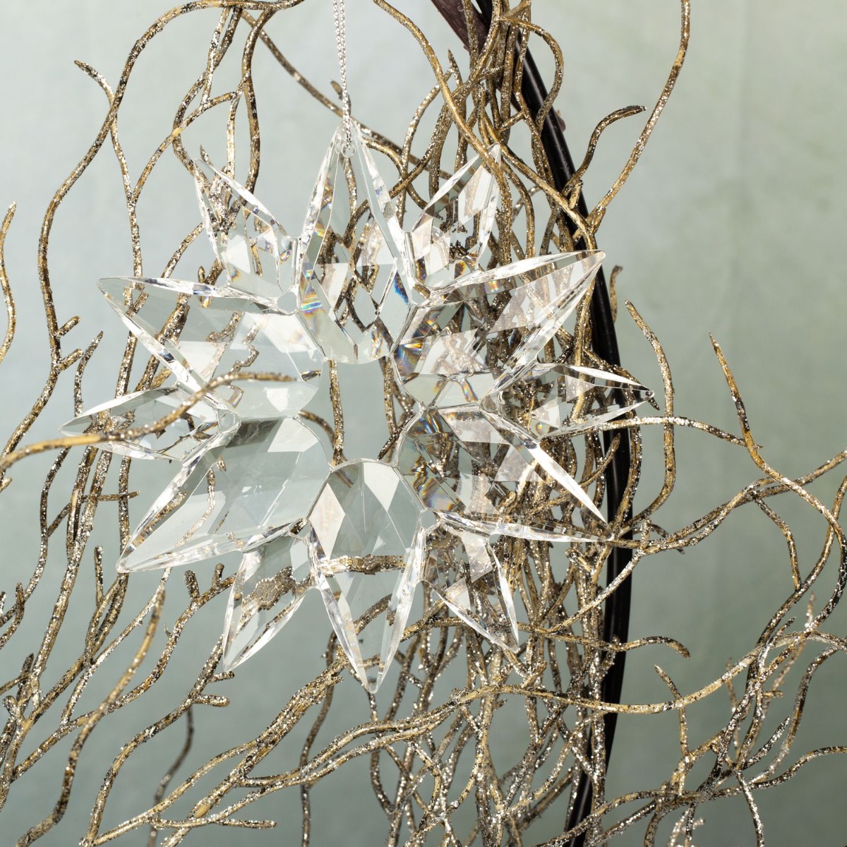 Consejo de decoración: Coloca primero el anillo metálico en la bandeja y luego rellénalo con musgo natural. Envuelve el aro con las ramas y decóralo con las estrellas acrílicas. Las velas se colocan simétricamente delante del arreglo, ya que son el elemento principal de este look.