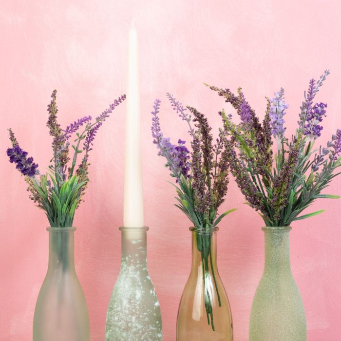 ¡Lavanda a la luz de las velas! Los diferentes tonos de verde de los frascos favorecen los diferentes tonos de morado de la lavanda. Una vela de palo de color crema destaca con fuerza y subraya los tonos morados y verdes. Con ella se puede crear una romántica decoración de mesa o una cómoda. Para unas veladas largas, acogedoras e inolvidables. ¿También quiere dar un nuevo brillo a su espacio vital? ¡Compre el look!
