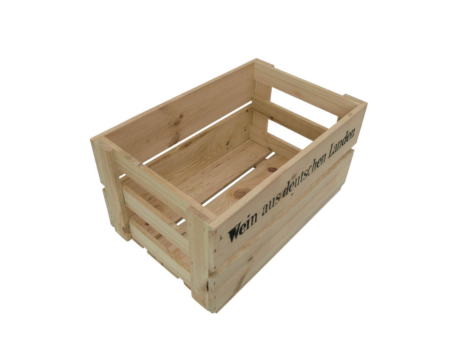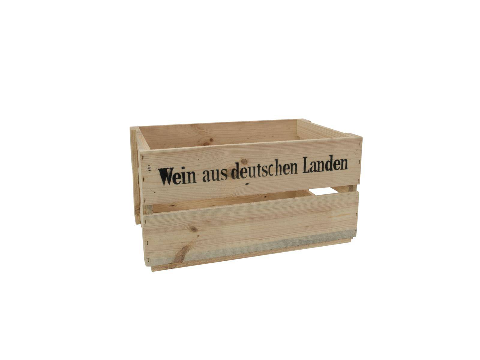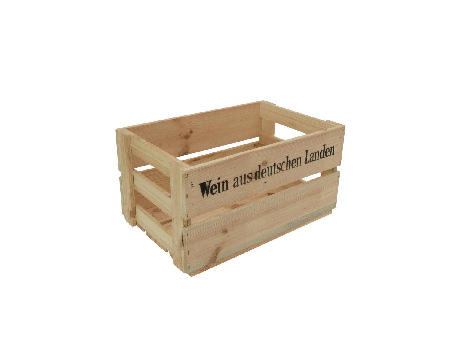 Bonita caja de vino GRETA en color natural con una inscripción negra y una altura total de aprox. 24 cm. La estable caja de madera es ideal para decoraciones en bares y es apta también para decoraciones en exteriores.