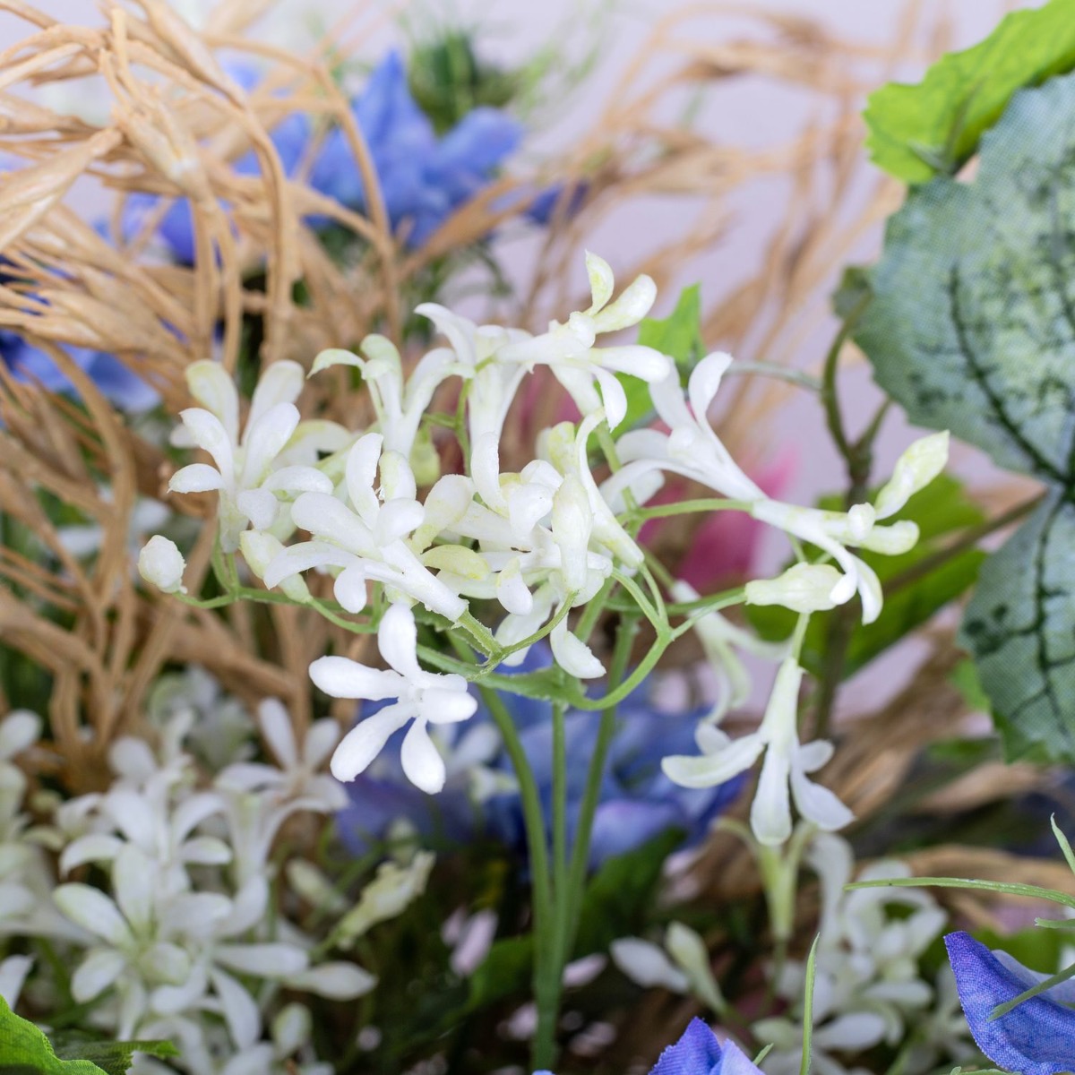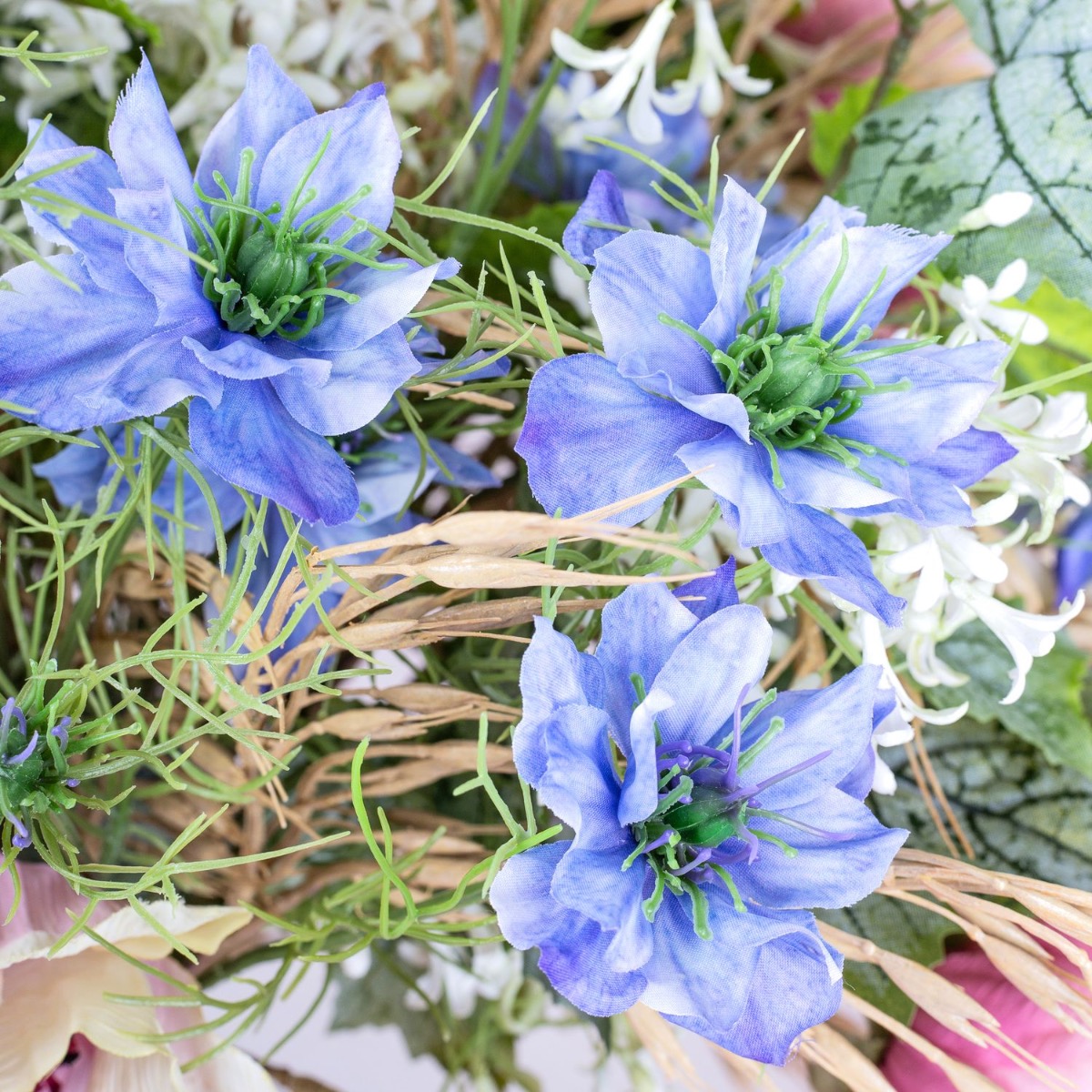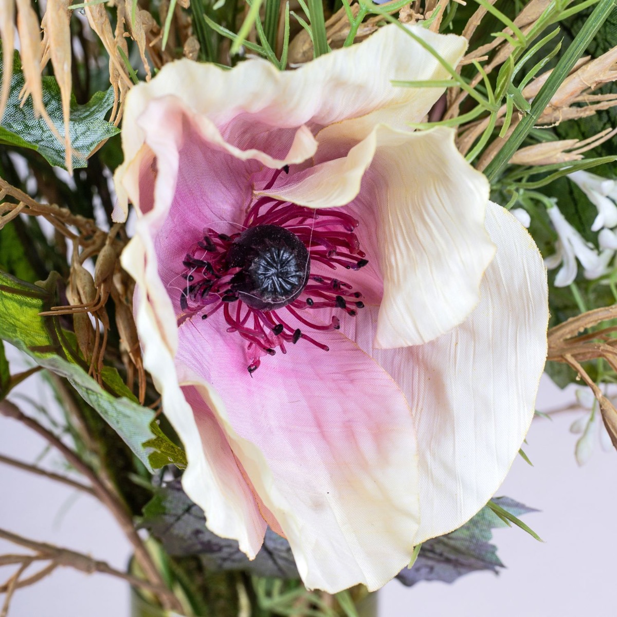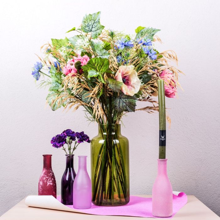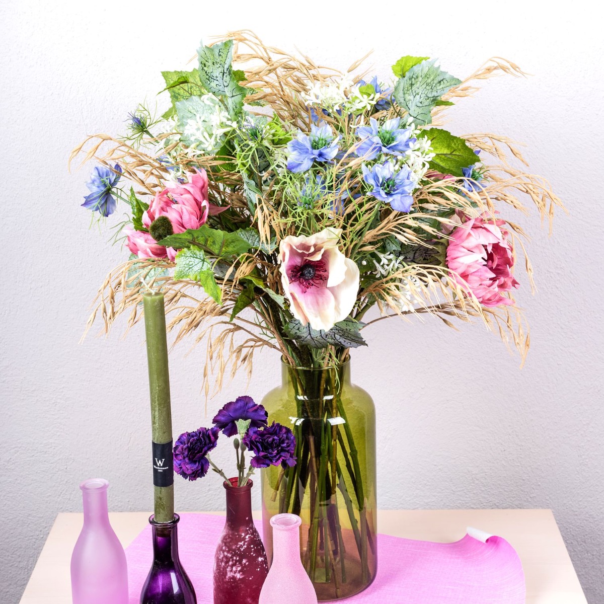 Brisa de verano llena de color! Un maravilloso ramo de flores del campo, confeccionado con gran atención al detalle, evoca el cálido aire veraniego y la ligereza que se siente al caminar por un prado de flores. Amapolas y girasoles rosas, así como acianos azules, se han combinado con suaves ramitas de avena y hojas de vid. Como si lo hubieras recogido tú mismo. Este look es puro romanticismo. Te enamorarás de él. Compra el look!
