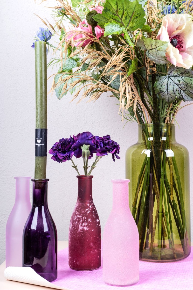 Consejo de diseño: Ata las diferentes flores en un ramo. Aquí se procede en espiral desde el interior hacia el exterior. Para todos aquellos que tienen poco talento o experiencia en la confección de ramos. También puedes colocar los componentes individuales directamente en el jarrón. Lo mejor es proceder desde el exterior hacia el interior.