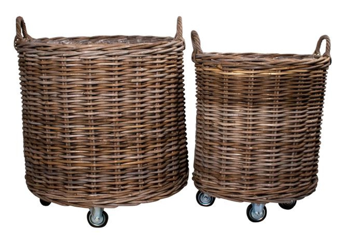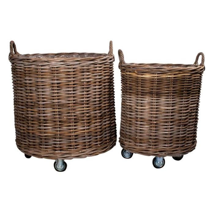 Cestas de ratán para leña ALGAN con asa, sobre ruedas, 2 piezas, redondas, marrón, 50-55cm, Ø50-65cm