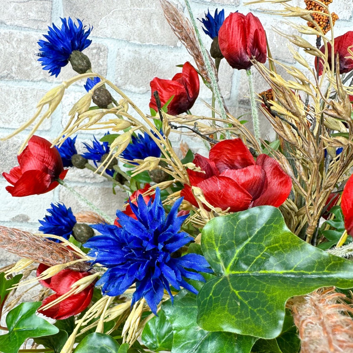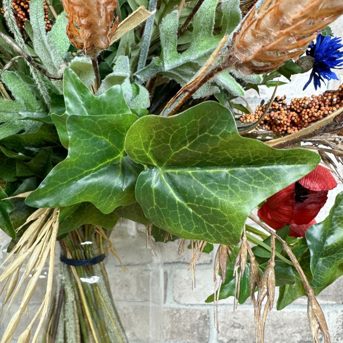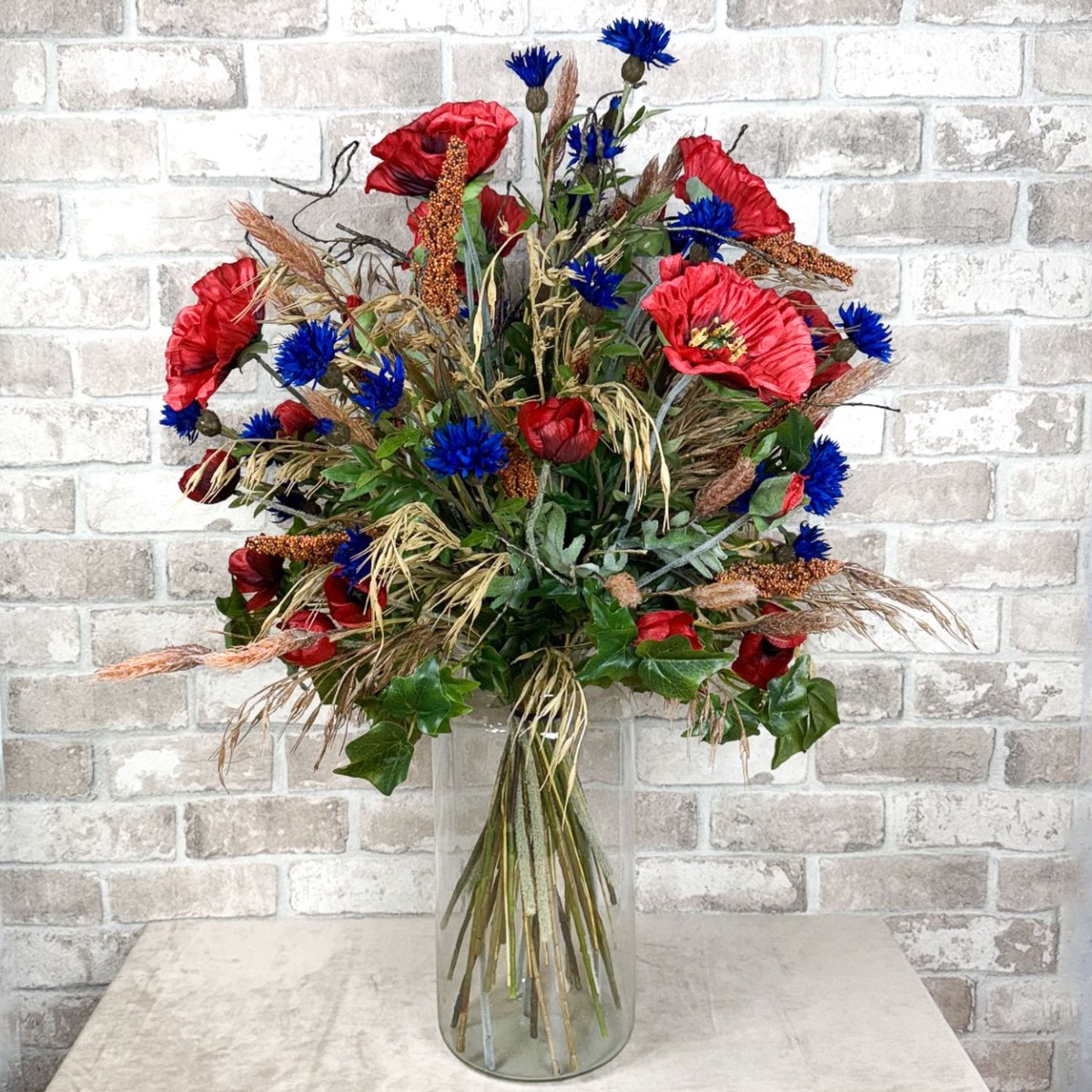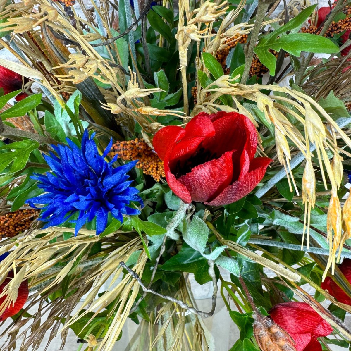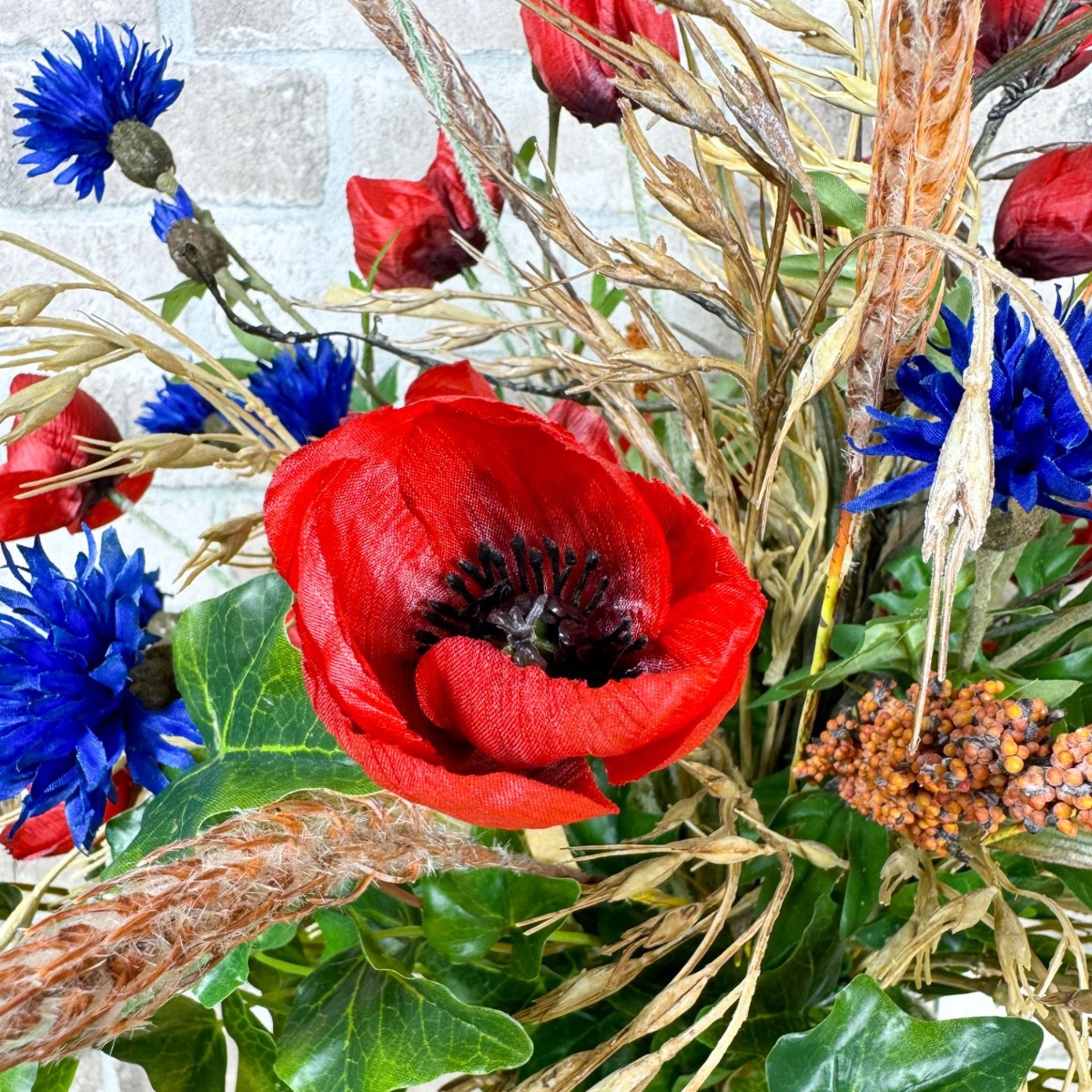 ¡Sinfonía del campo y la pradera! Matthias nos preguntó si podíamos crear dos ramos para sus dos jarrones. En términos de estilo, estos deben combinar con un arreglo floral artificial existente hecho de flores silvestres y fijado a una tabla de madera. Con esta especificación, la selección de flores se pudo realizar rápidamente; además de amapolas y acianos, también había hiedra, salix matsudana y, por supuesto, algunas espigas de trigo, arrhenatherum elatius y mijo de sorgo. Las espigas, con su color dorado y sus suaves curvas, confieren al ramo un ambiente cálido y rural. Simbolizan la abundancia y el tiempo de cosecha y aportan una naturalidad calmante al ramo. Las flores pequeñas y grandes de la amapola y los acianos rodean hábilmente las mazorcas y también aportan fantásticos acentos de color. Las ramas del salix matsudana serpentean a través del ramo y apuntan con audacia hacia la parte superior. Finalmente, las ramas de hiedra completan perfectamente el ramo y le dan una plenitud natural. ¿Tú también quieres la belleza del campo en tu hogar? ¡Compra el look!
