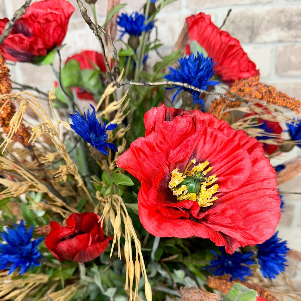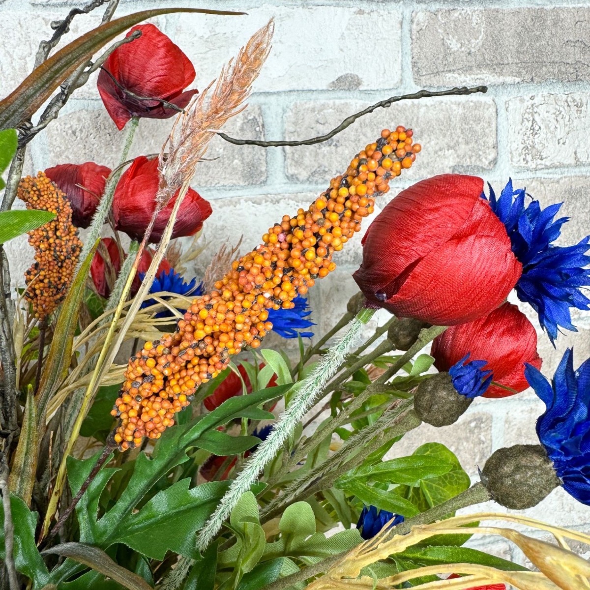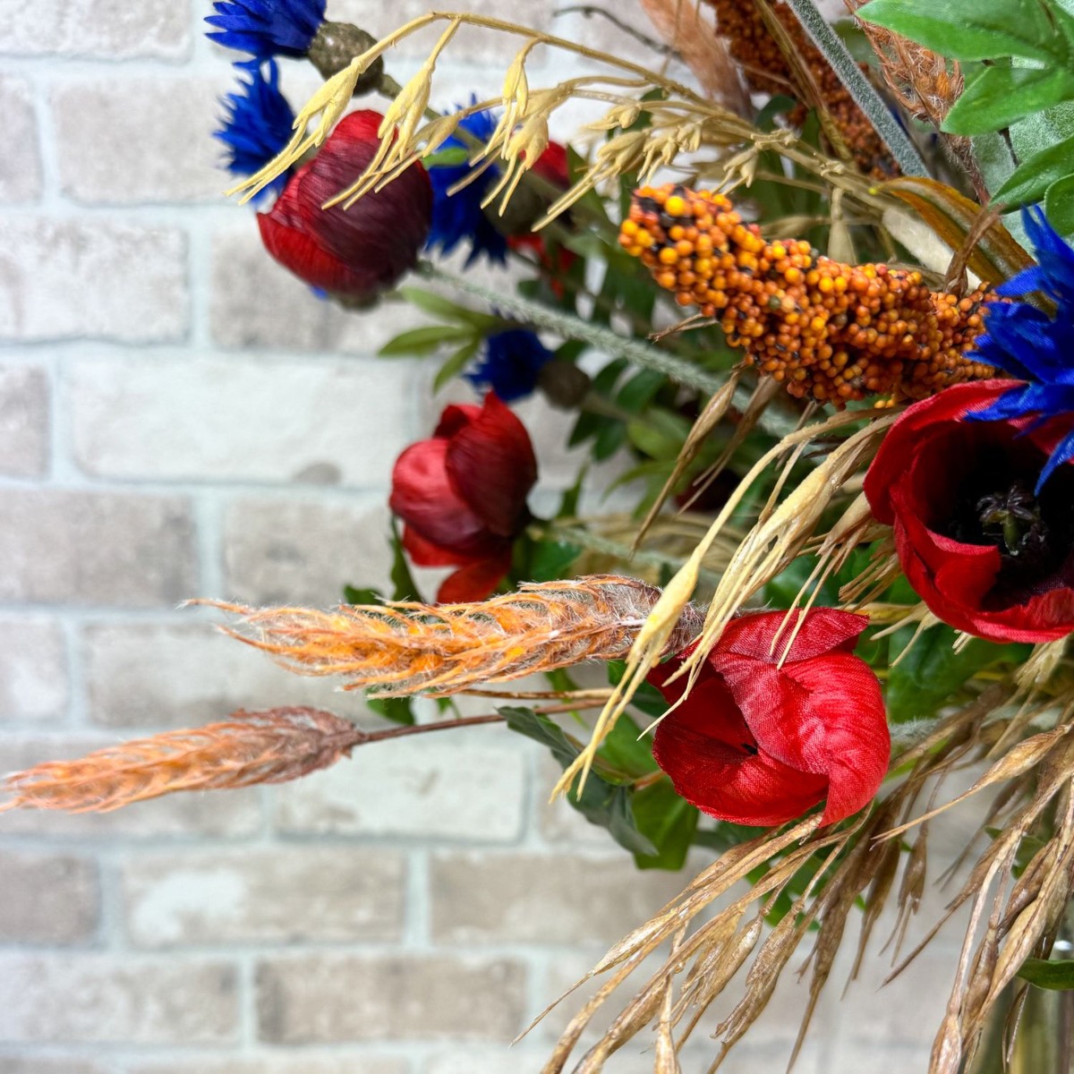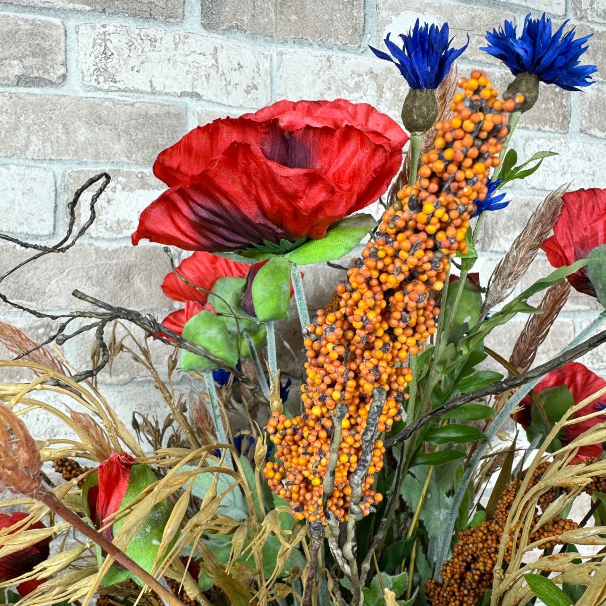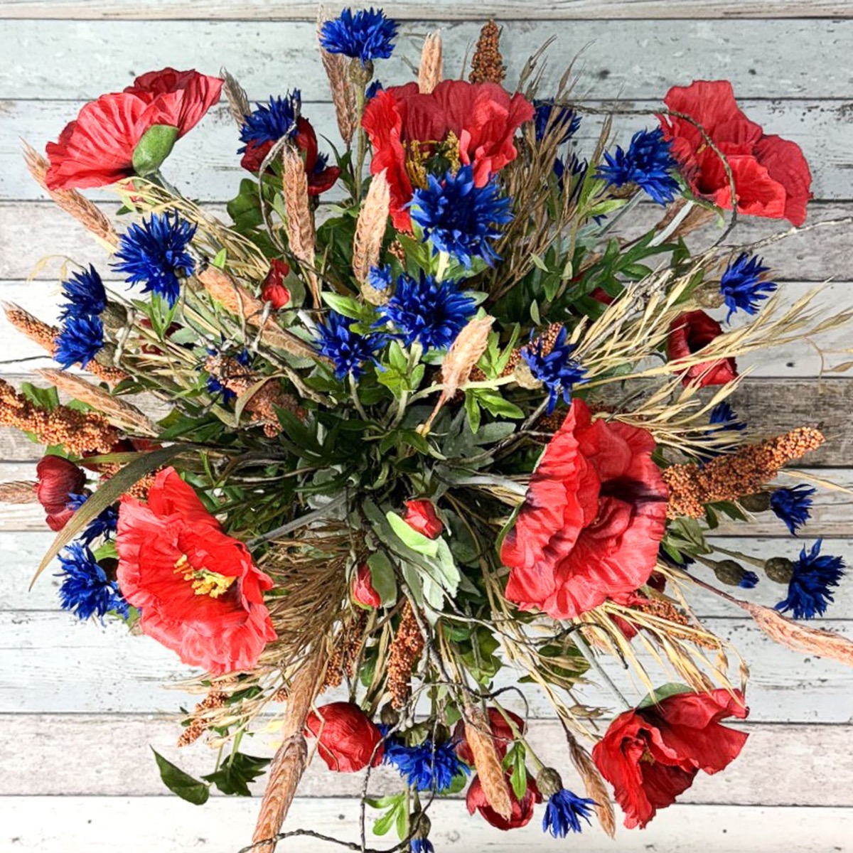 ¡Sinfonía del campo y la pradera! Matthias nos preguntó si podíamos crear dos ramos para sus dos jarrones. En términos de estilo, estos deben combinar con un arreglo floral artificial existente hecho de flores silvestres y fijado a una tabla de madera. Con esta especificación, la selección de flores se pudo realizar rápidamente; además de amapolas y acianos, también había hiedra, salix matsudana y, por supuesto, algunas espigas de trigo, arrhenatherum elatius y mijo de sorgo. Las espigas, con su color dorado y sus suaves curvas, confieren al ramo un ambiente cálido y rural. Simbolizan la abundancia y el tiempo de cosecha y aportan una naturalidad calmante al ramo. Las flores pequeñas y grandes de la amapola y los acianos rodean hábilmente las mazorcas y también aportan fantásticos acentos de color. Las ramas del salix matsudana serpentean a través del ramo y apuntan con audacia hacia la parte superior. Finalmente, las ramas de hiedra completan perfectamente el ramo y le dan una plenitud natural. ¿Tú también quieres la belleza del campo en tu hogar? ¡Compra el look!