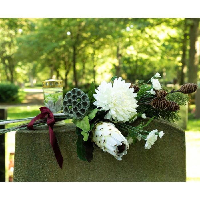 ¡Los colores del luto! Cuando se pierde a un ser querido, la vida cambia significativamente. Lo que queda es el recuerdo. El Día de Todos los Santos conmemoramos a los difuntos y recordamos vidas maravillosas. Las tumbas se cuidan y se decoran con flores nuevas. Es muy práctico que las flores no se marchiten y adornen la tumba permanentemente. No se marchitan, no hay que regarlas... y el efecto es realmente natural. El color blanco se utilizó aquí como símbolo de pureza y representa el amor no adulterado y el luto. La majestuosa protea, el crisantemo blanco y el loto forman un ramo extraordinario, digno de honrar a una persona extraordinaria. ¡Compra el look!