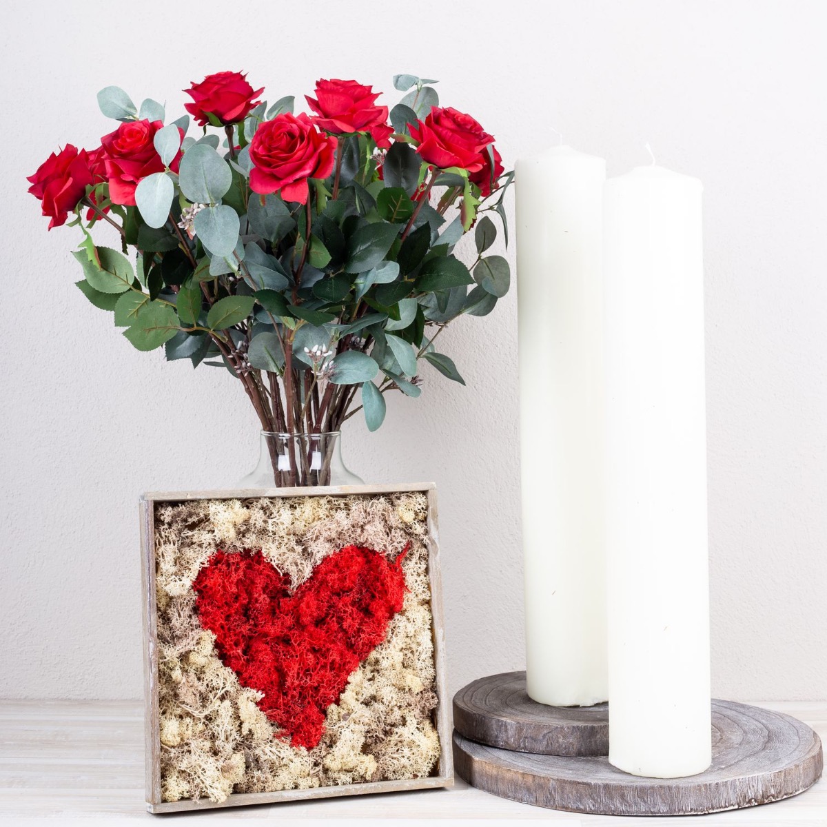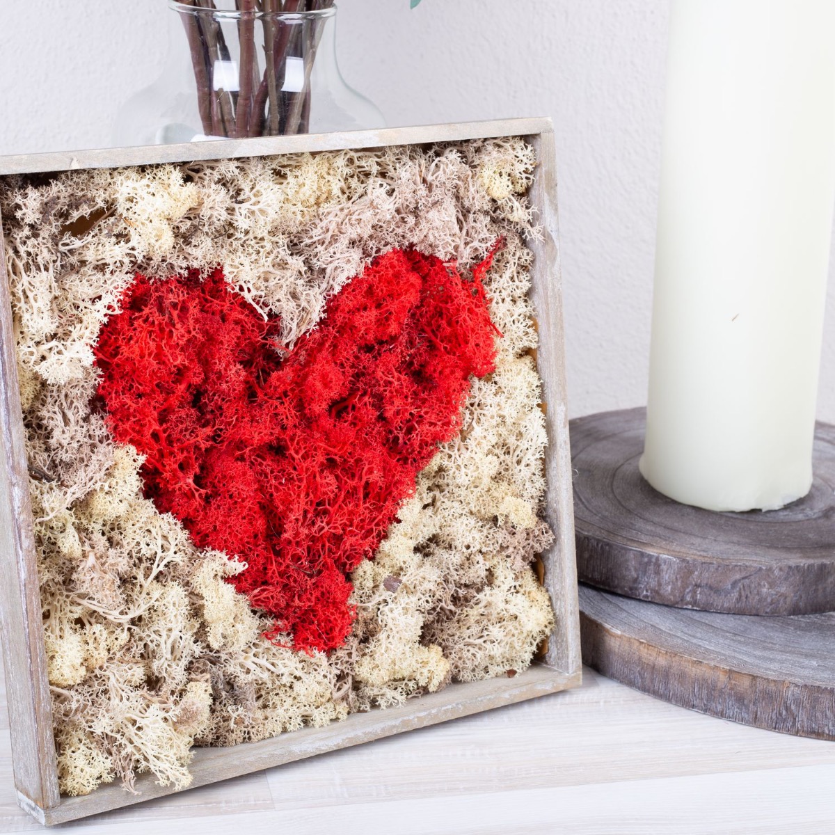 Consejo de diseño: Dobla ligeramente las rosas y átalas formando un ramo. Si es necesario, acórtalo al tamaño de un jarrón. Para el corazón de musgo natural necesitas una pistola de pegamento caliente. Se empieza por el corazón y se pega el musgo natural rojo en forma de corazón en la bandeja de madera convertida en marco. El contorno del corazón puede resultar un poco impreciso, lo que crea un efecto natural. Una vez que estés satisfecho con la forma del corazón, rellena el resto del marco de madera con el segundo color de musgo.