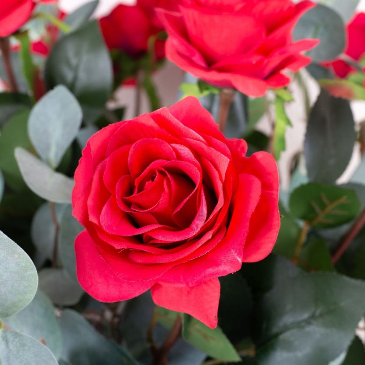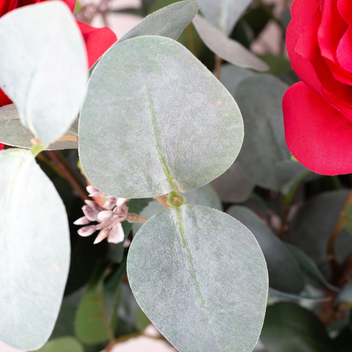 ¡Un corazón y rosas rojas! No hay mejor declaración de amor. El ramo de rosas se compone de 12 rosas textiles de tallo largo que se encuentran en un jarrón de cristal estilo boticario. Las ramas de eucalipto traen un toque fresco y colorido al ramo. Nuestro corazón hecho a mano de musgo natural no solo es hermoso para verlo en el Día de San Valentín o el Día de la Madre, sino que también te recuerda el amor y el afecto del obsequio durante mucho tiempo. ¡Compra el look!
