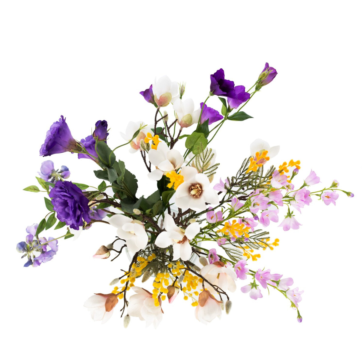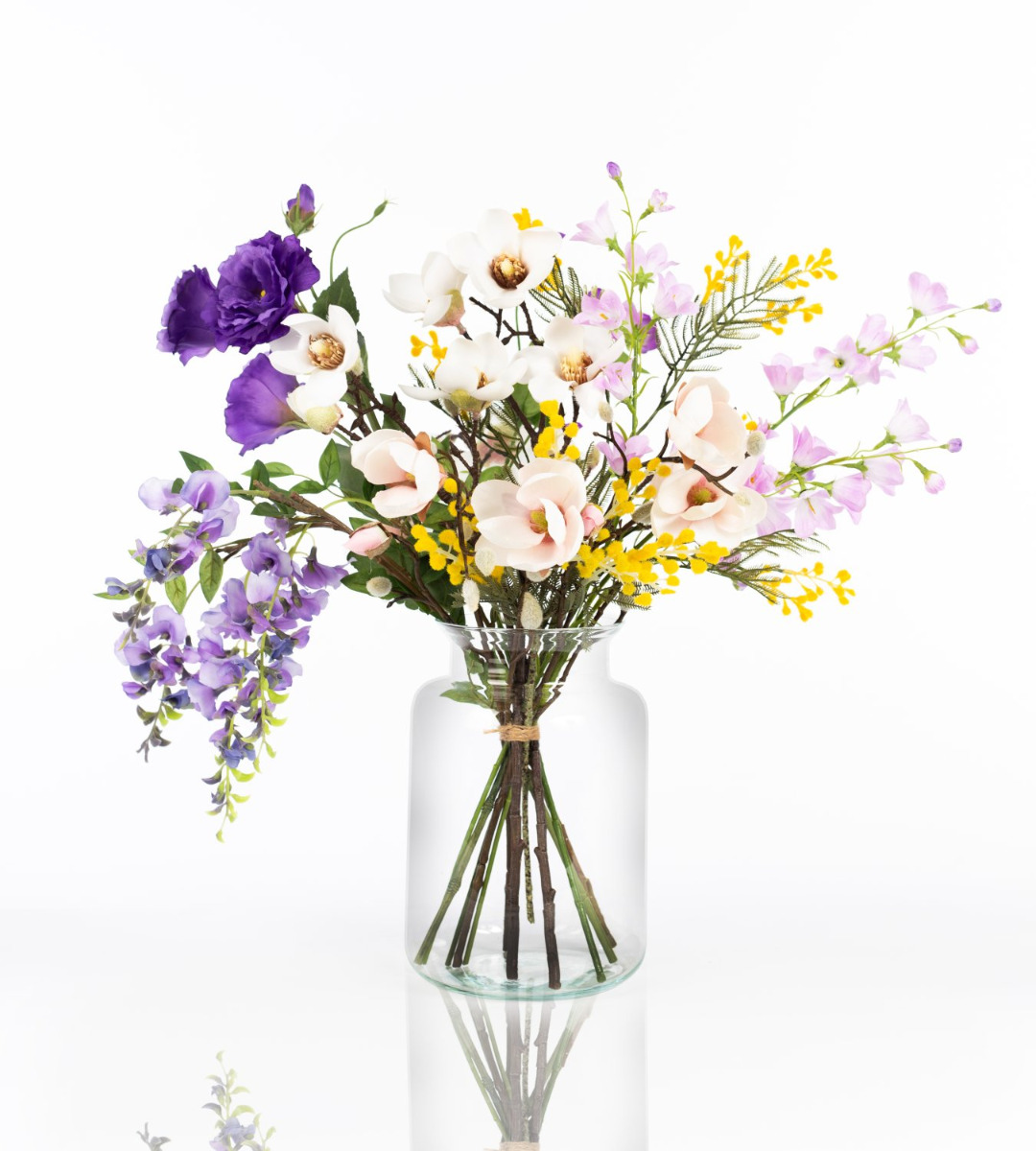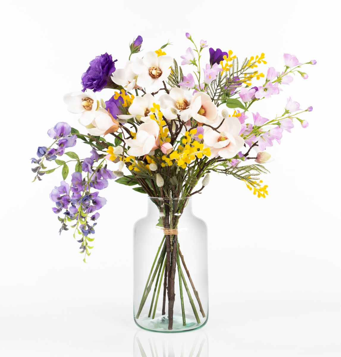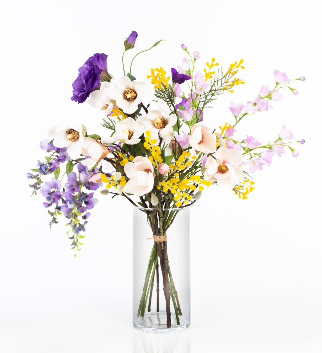 Con el colorido ramo CALISSA recibirás un regalo floral de extraordinaria belleza. Las glicinas colgantes, los exuberantes lisianthus y las delicadas campanillas se complementan con tiernas ramas de magnolia. Las pequeñas flores de la mimosa amarilla dan el toque final al ramo, asomando alegremente entre las flores grandes.