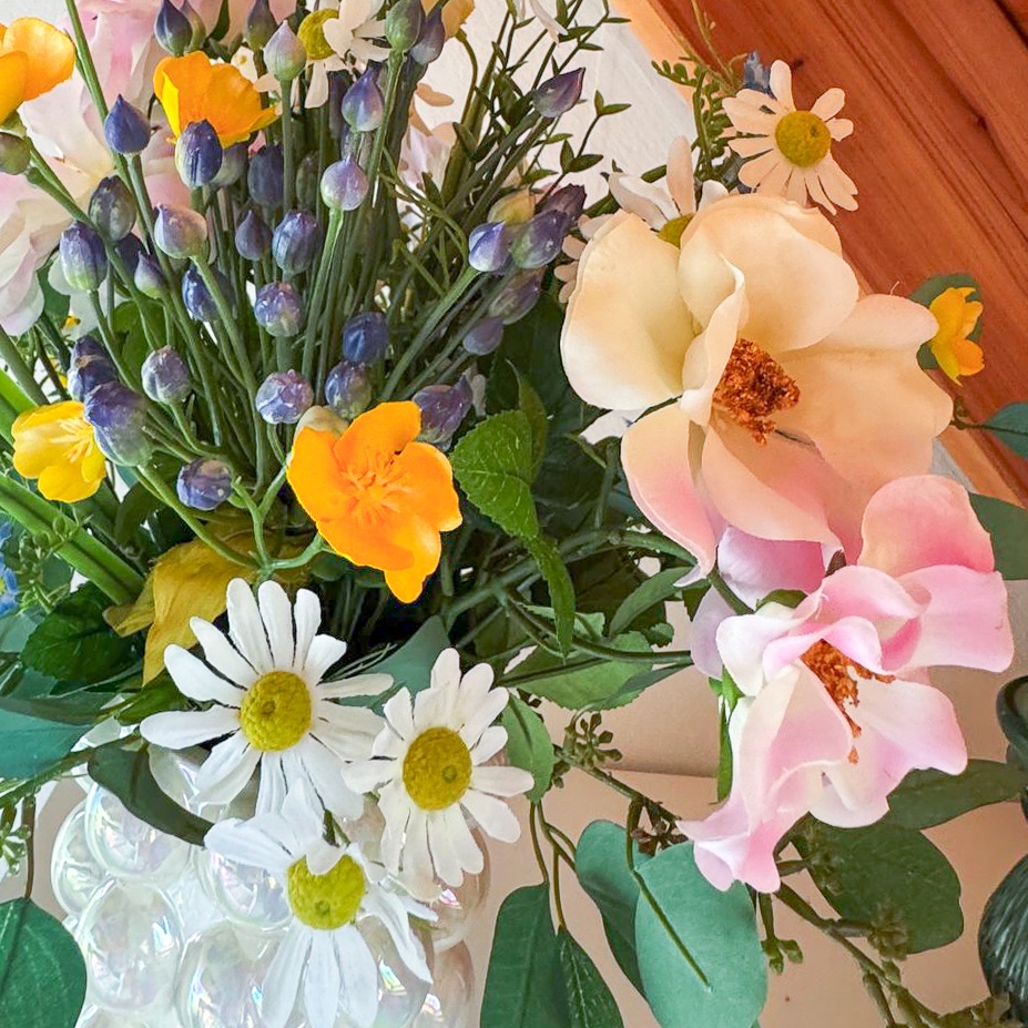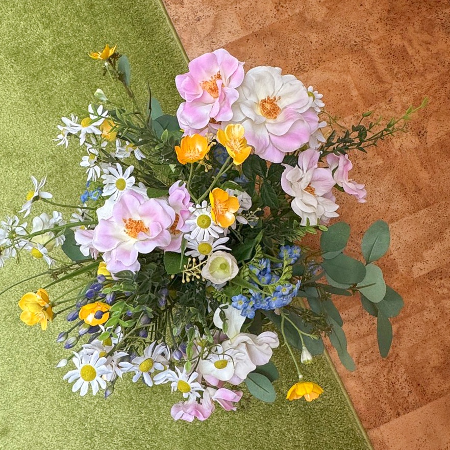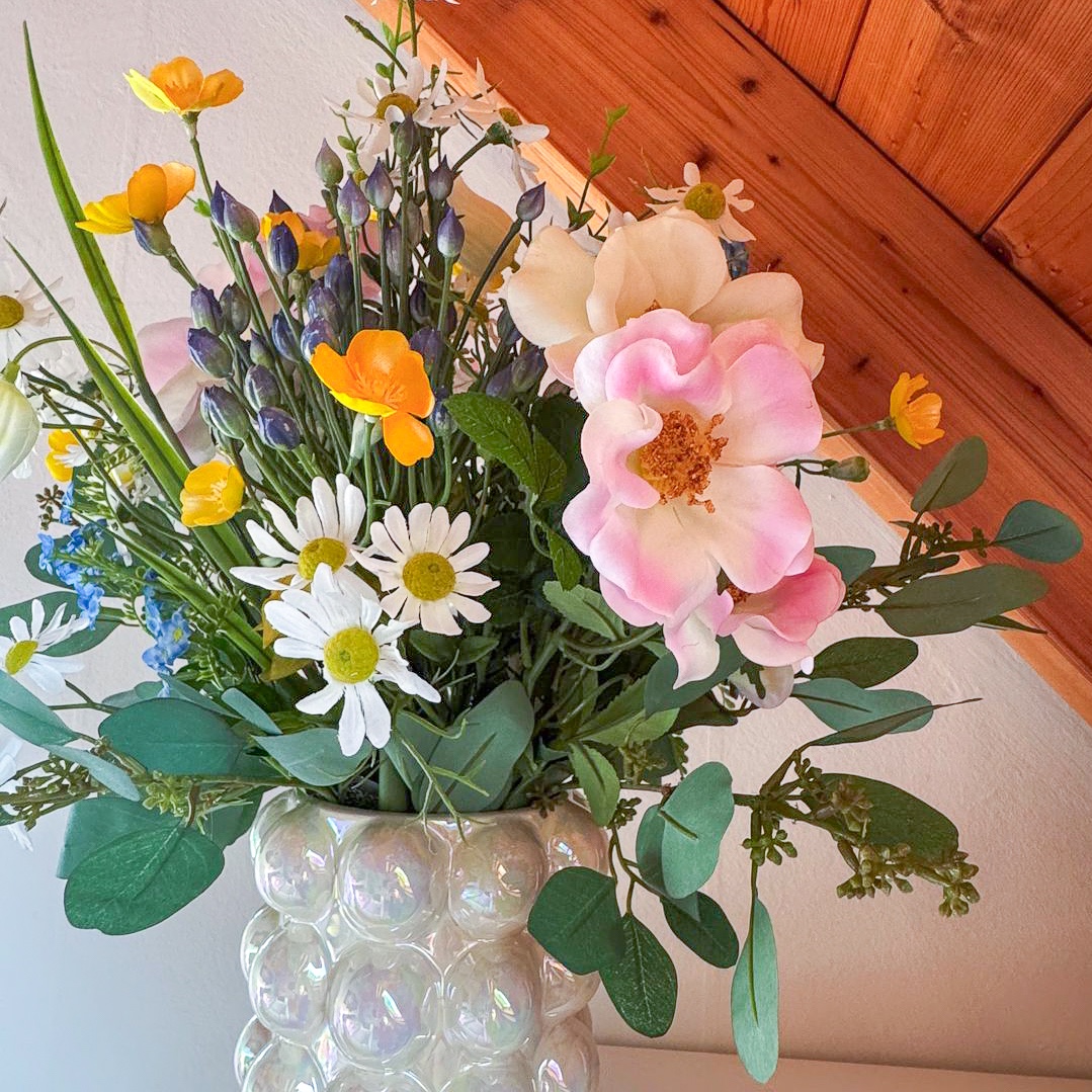 ¡Un toque veraniego que aporta tranquilidad y belleza a cualquier estancia! Este ramo artificial lleva la relajada elegancia de un cálido día de verano directamente a tu hogar, sin la fugacidad de las flores naturales. Las rosas silvestres de color rosa aportan al arreglo un ambiente suave, mientras que la manzanilla entre ellas crea una sensación de tranquilidad natural. Las campanillas blancas se extienden con delicadeza y aportan al ramo un toque claro, casi minimalista, que se suaviza agradablemente con el delicado amarillo de las ranúnculos. Los brotes de ajo ornamental azul añaden un toque de modernidad, y su forma clara aporta estructura al ramo. Las delicadas flores de nomeolvides se entrelazan entre ellas y aportan un toque de color ligero y discreto. Todo ello enmarcado por ramas de eucalipto y ligustro, que dan al ramo una silueta tranquila y equilibrada, perfecta para aquellos que aman el aspecto natural, pero quieren prescindir de las flores reales. ¡Compra el look!