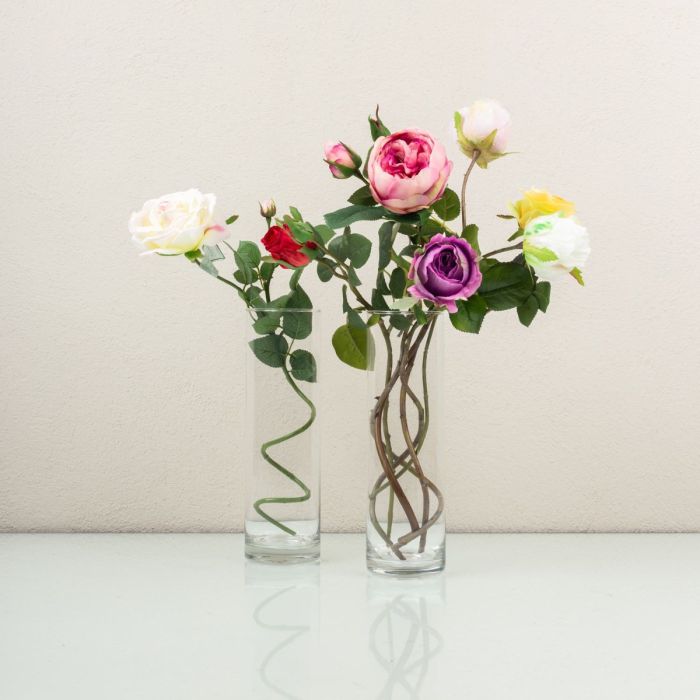 ¡Coloridas y pintorescas! Cuando piensas en flores artificiales, inmediatamente piensas en las rosas artificiales que puedes fotografiar en una feria. Pero sabemos que existen rosas artificiales realmente excepcionales y de alta calidad. Rosas que son casi más hermosas que las reales. Las diferentes rosas están curvadas para que sobresalgan de los jarrones cilíndricos y creen una imagen divertida ¡Compra el look!< /p>.