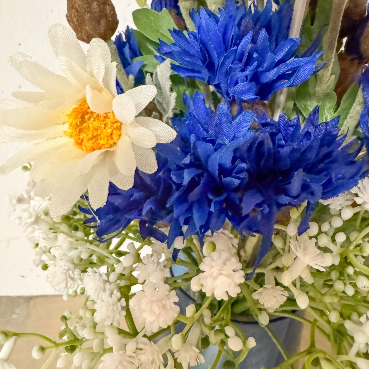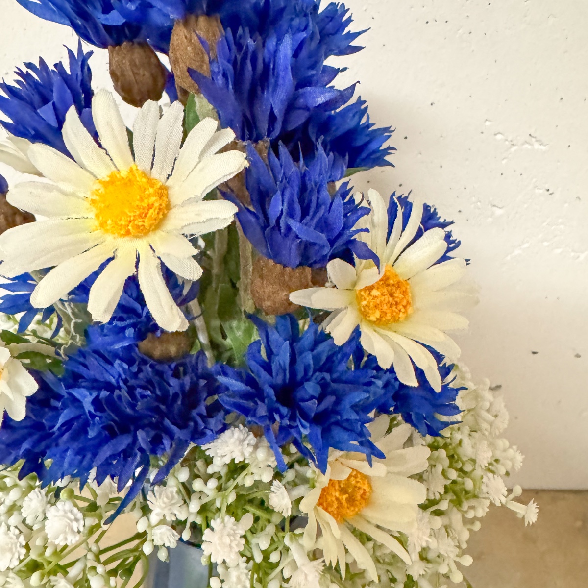 ¡Amor nupcial! Así es un ramo de novia bávaro. Como sorpresa, nos encargaron recrear el ramo de novia, que lamentablemente ya se había marchitado, con flores artificiales. Brillantes acianos azules, delicadas margaritas y gypsophila adornan este ramo de novia en forma de pirámide y aportan un toque romántico a la celebración. La gypsophila simboliza el amor sincero. Las margaritas representan la fidelidad y los acianos auguran un futuro positivo. Un cordón de yute marrón subraya el aspecto rústico. ¡Compra el look!