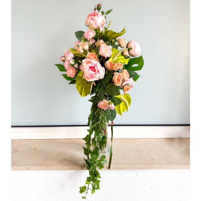 ¡Renovación de los votos matrimoniales! Holger se puso en contacto con nosotros por teléfono para contarnos su petición. Él y su mujer querían una réplica de su ramo de novia artificial de hace 25 años, ya que empezaba a estar viejo. Sin embargo, tuvimos que decirles enseguida que no era posible una réplica exacta debido al tiempo y al color. Esto no supuso ningún problema para el cliente. El ramo original es albaricoque-anaranjado claro con matices verdes, tuve que cambiar esta combinación de colores a rosa-verde. Así que busqué rosas de color rosa claro con cabezas de flores de diferentes tamaños, así como una flor de color verde rosado con una forma de flor inusual, aquí encontré una flor de anturio que combinaba muy bien con las rosas. Como era un ramo en cascada, añadí hiedra, briznas de hierba y un manguito de hojas de Philodendron Monstera Deliciosa. Una vez terminado el ramo, enviamos a nuestro cliente una primera propuesta del ramo de novia, que gustó mucho a Holger y a su mujer. Recogió el ramo directamente de nuestro local. ¿También quieres un ramo de novia decorativo? ¡Compre el look!