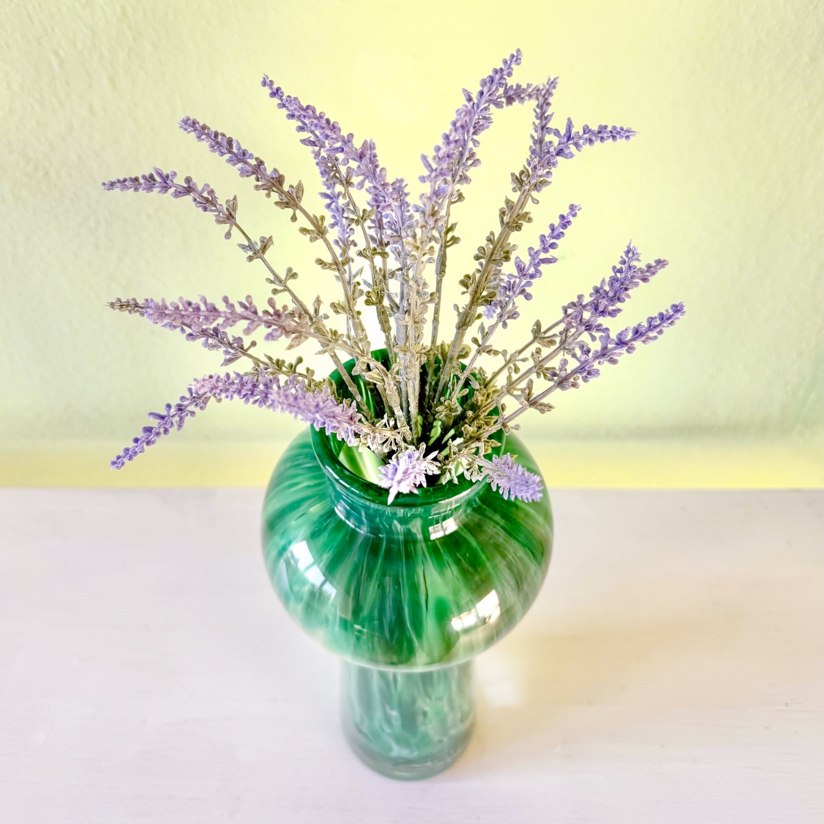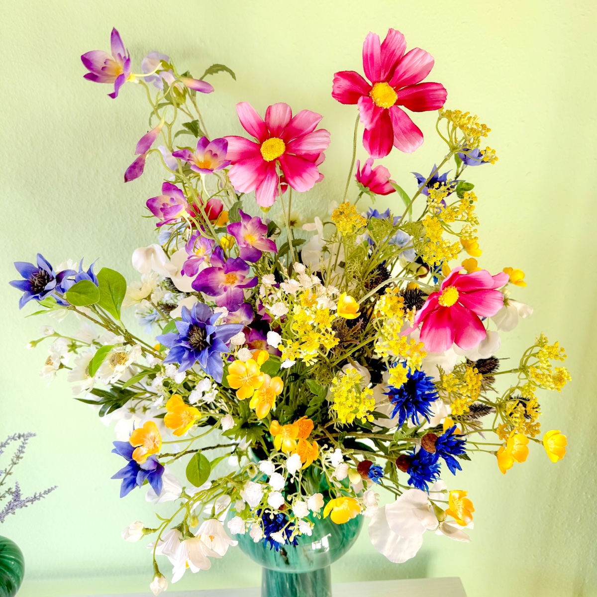 ¡Juguetón. Fresco. Lleno de vida! A veces son las ideas ya materializadas las que aportan nueva inspiración: este ramo surgió del deseo de una clienta de revivir un encargo anterior y desarrollarlo según sus propias ideas. El ramo de pradera, atado de forma desenfadada, retoma la ligereza natural del original y convence por su aura armoniosa y llena de vida. Diferentes flores se combinan en un arreglo que parece recogido al azar y, sin embargo, está diseñado con mucha delicadeza. El conjunto se complementa con un ramo de lavanda dispuesto por separado en un jarrón a juego, que aporta un contraste tranquilo y suave. Una planta en maceta de «Glückstaler» redondea el conjunto y aporta un toque moderno y claro, como símbolo de constancia y felicidad. Así se crea una combinación armoniosa de ligereza floral y complemento decorativo, interpretada de forma individual y realizada con amor por el detalle. Un look que muestra cómo la inspiración se convierte en algo totalmente propio: personal, atemporal y lleno de belleza natural. ¡Compra el look!