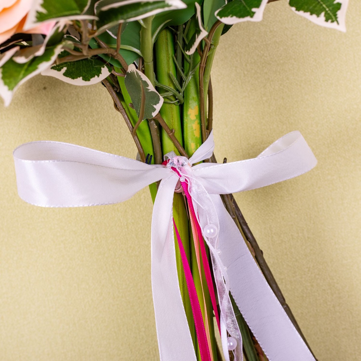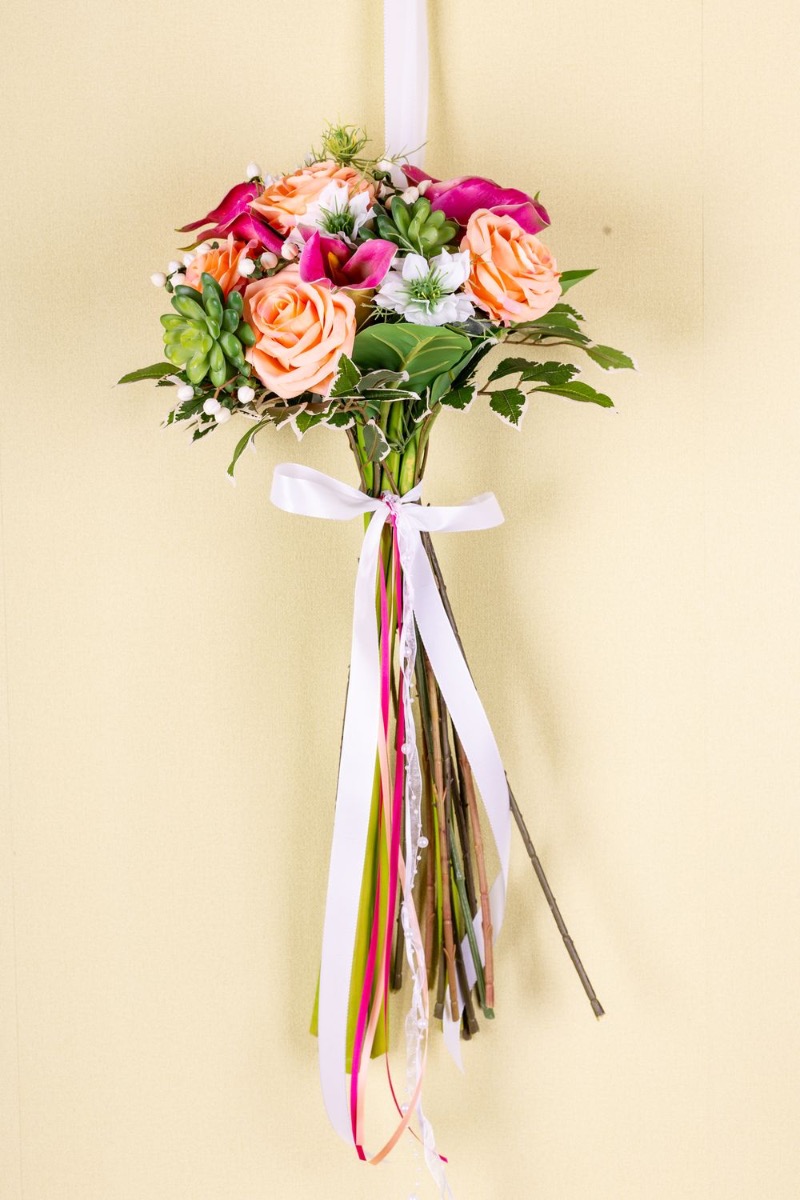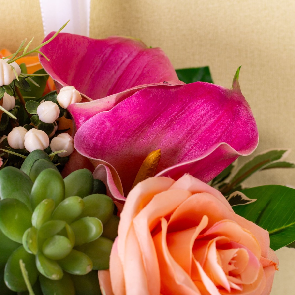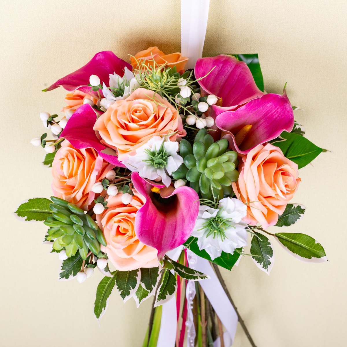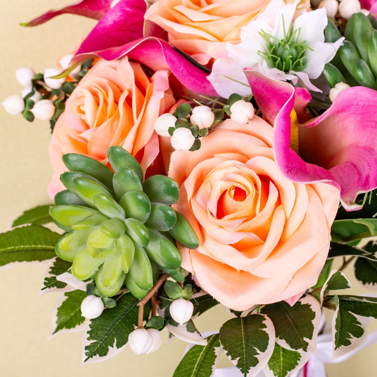 ¡Sorprendentemente imponente! Como sorpresa para Navidad, nuestro cliente Dylan pensó en recrear el ramo de novia de su esposa con flores artificiales y nos escribió un mensaje. A pesar del corto tiempo de entrega, logramos crear una copia atractiva hecha de flores artificiales. En este artístico arreglo predominan las calas rosadas y las rosas color albaricoque, que son las principales protagonistas de este encantador ramo. Las calas rosadas, con sus cálices elegantemente curvados, dan al ramo cierta gracia y sofisticación, mientras que las rosas albaricoque, con su color delicado y su plena floración, crean una atmósfera cálida y acogedora. En contraste con las delicadas flores, se añadieron suculentas, que aportan al ramo una nota terrosa y natural con su estructura robusta y sus jugosos tonos verdes. Añaden textura y profundidad al arreglo y brindan un interesante contraste visual con las otras flores. ¿Quieres también un ramo de novia artificial? ¡Compra el look!