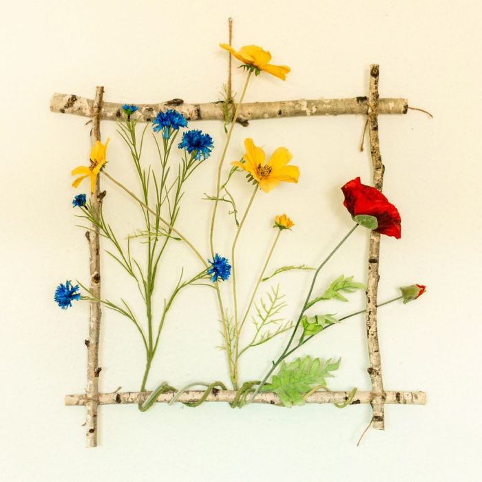 Consejo de diseño: Ata las ramas de abedul en ángulo recto para crear un cuadrado. A un lado colocamos una percha, también con cordón de paquete. Así puedes colgar el cuadro fácilmente en la pared con un clavo. Tienes que experimentar un poco y encontrar el lugar adecuado para colgarlo para que el cuadro cuelgue derecho. Los tallos de las flores simplemente se enrollan alrededor del borde inferior. Ahora simplemente dobla las flores y listo.
