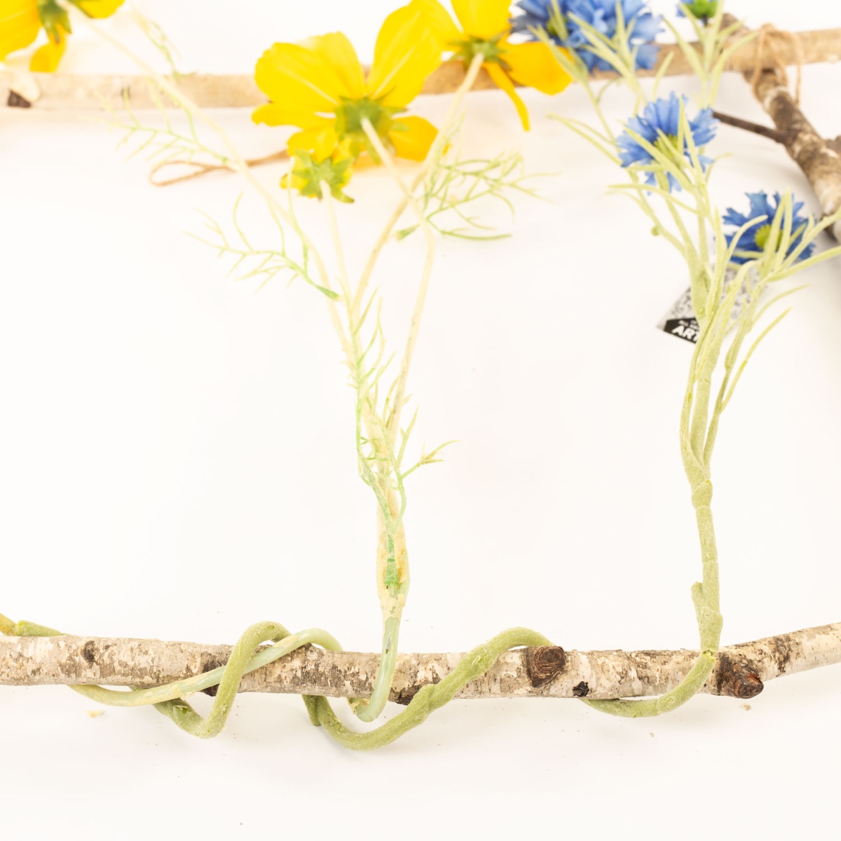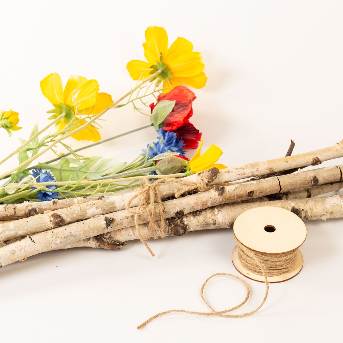 ¡Rojo, amarillo y azul! ¿Ramas de flores como imagen? ¡Esta es una decoración veraniega que no todo el mundo tiene! Las ramas de abedul son perfectas para hacer un marco. Una amapola de color rojo brillante, un aciano azul real y una cosmea de color amarillo soleado rodeaban nuestro marco de fabricación propia. Al seleccionar estas bellezas clásicas, creas un personaje de prado de flores veraniego que te invita a soñar. ¡Compra el look!