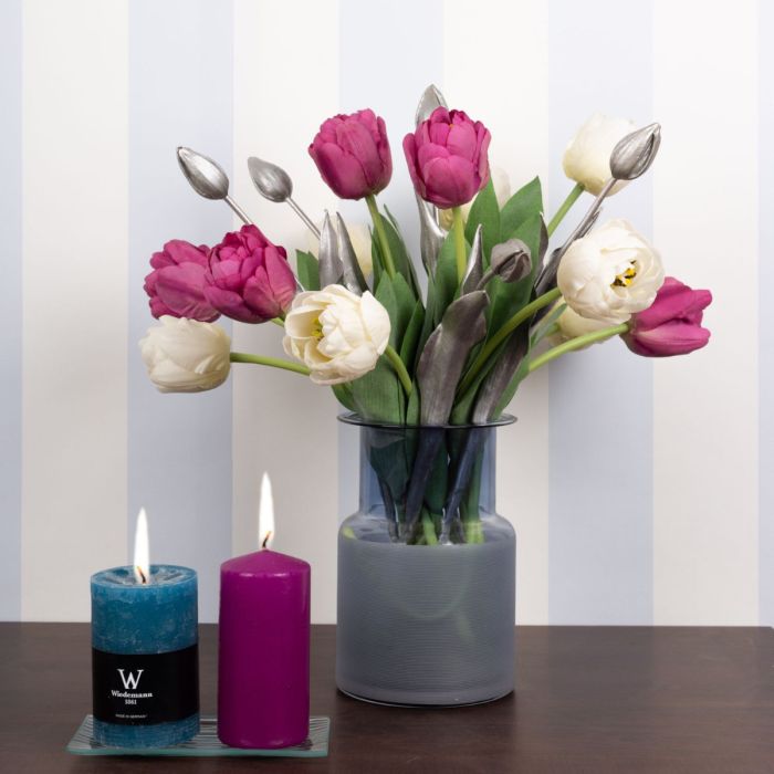 ¡Piensa en rosa! ¡Por fin llega la primavera! Después de un largo invierno, ¡estamos literalmente esperando unos rayos de sol y la primavera que los acompaña! Pero incluso antes de que los tulipanes empiecen a florecer en la naturaleza, podemos traer la colorida estación a nuestros hogares. Nuestros tulipanes rosas y blancos parecen tan reales que hay que mirar dos veces para darse cuenta de que son flores artificiales. Los tulipanes plateados le dan un toque moderno y único. Quien piense que con el frío se acabaron las velas, se equivoca. A la gente también le gusta encender una vela en Pascua. Lleva la primavera a tu hogar. ¡Compra el look!