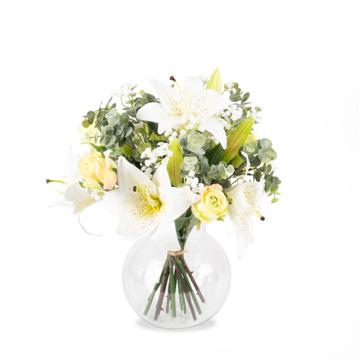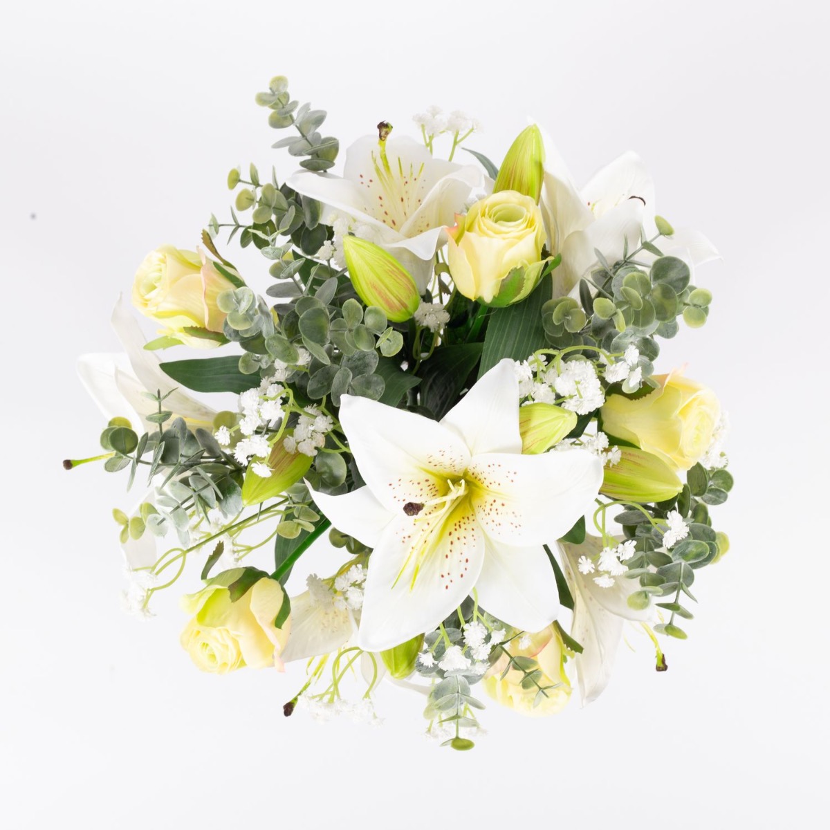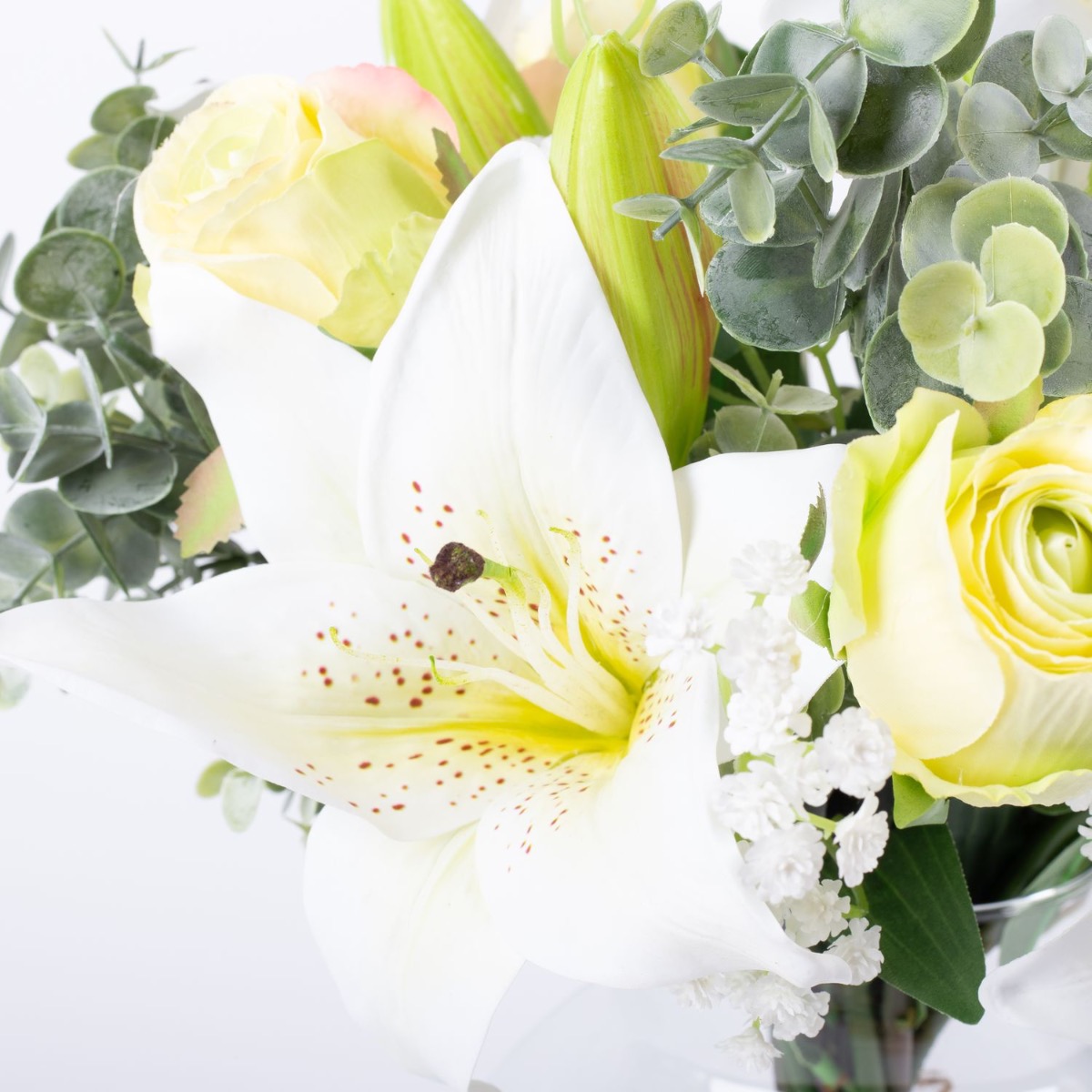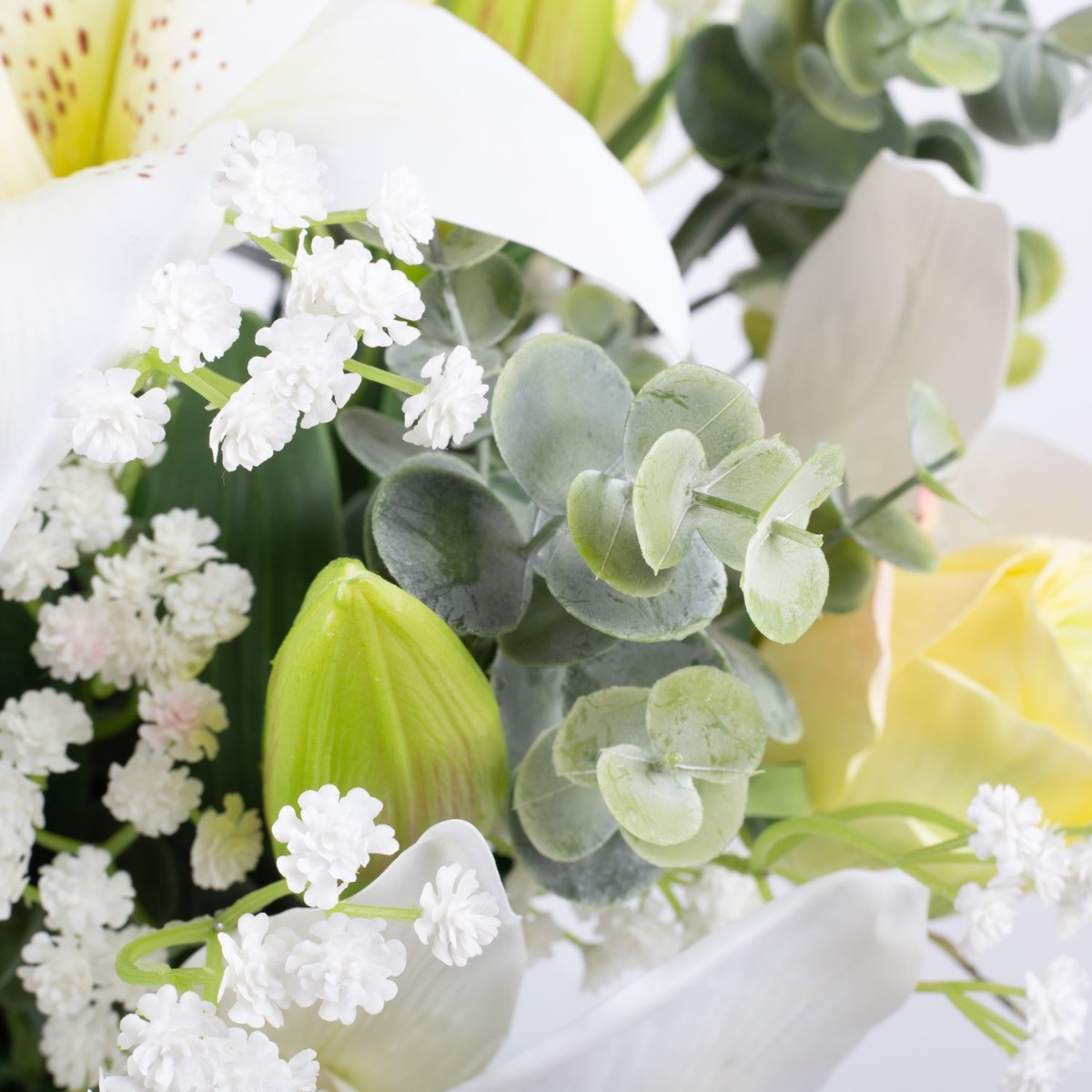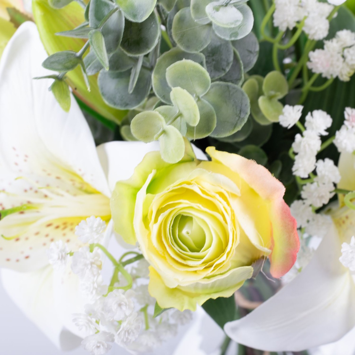 El elegante ramo artificial MARIPOSA de lirios blancos y rosas verdosas simboliza el renacimiento y la pureza. El conjunto floral se utiliza tanto en bodas como en funerales y se completa con eucalipto moderno y ramas clásicas de gypsophila.