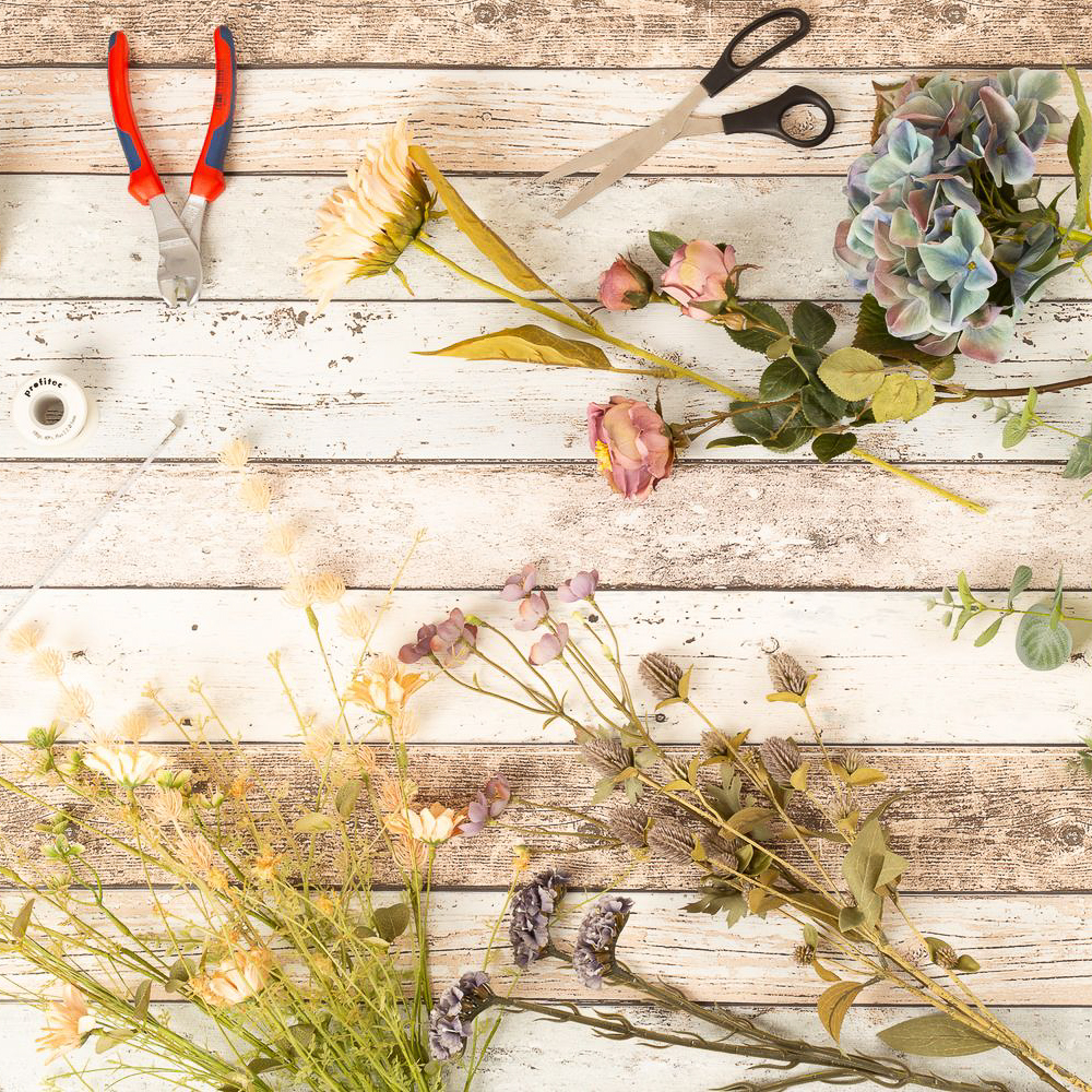 - Atado con un cordón de sisal, las flores y las ramas se pueden cortar individualmente o, tras retirar el cordón, se pueden utilizar por separado para proyectos creativos