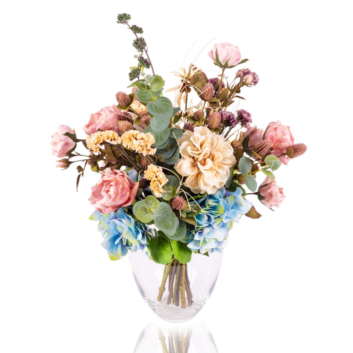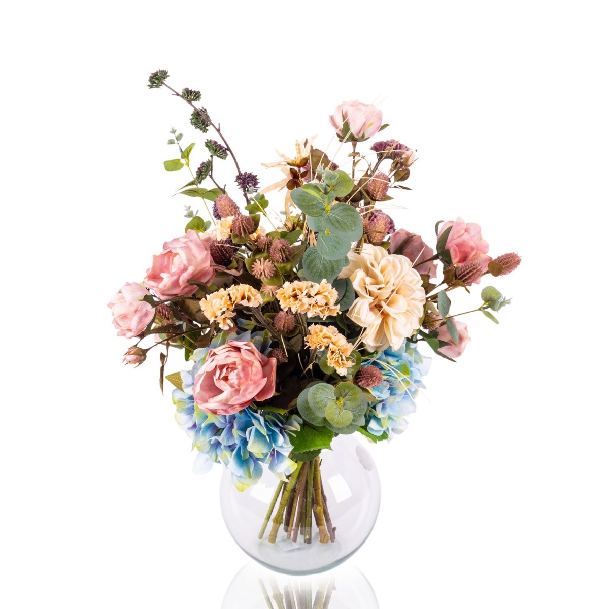 Una gran variedad de delicadas flores rodean las exuberantes cabezas de hortensias del ramo otoñal TRIANA. La combinación de colores es absolutamente armoniosa y despierta la alegría del otoño. La calidez que representa el ramo con sus colores aporta comodidad a su hogar. Su mesa estará perfecta con este ramo otoñal, ya que las flores son tan realistas que casi no se distinguen de las naturales.