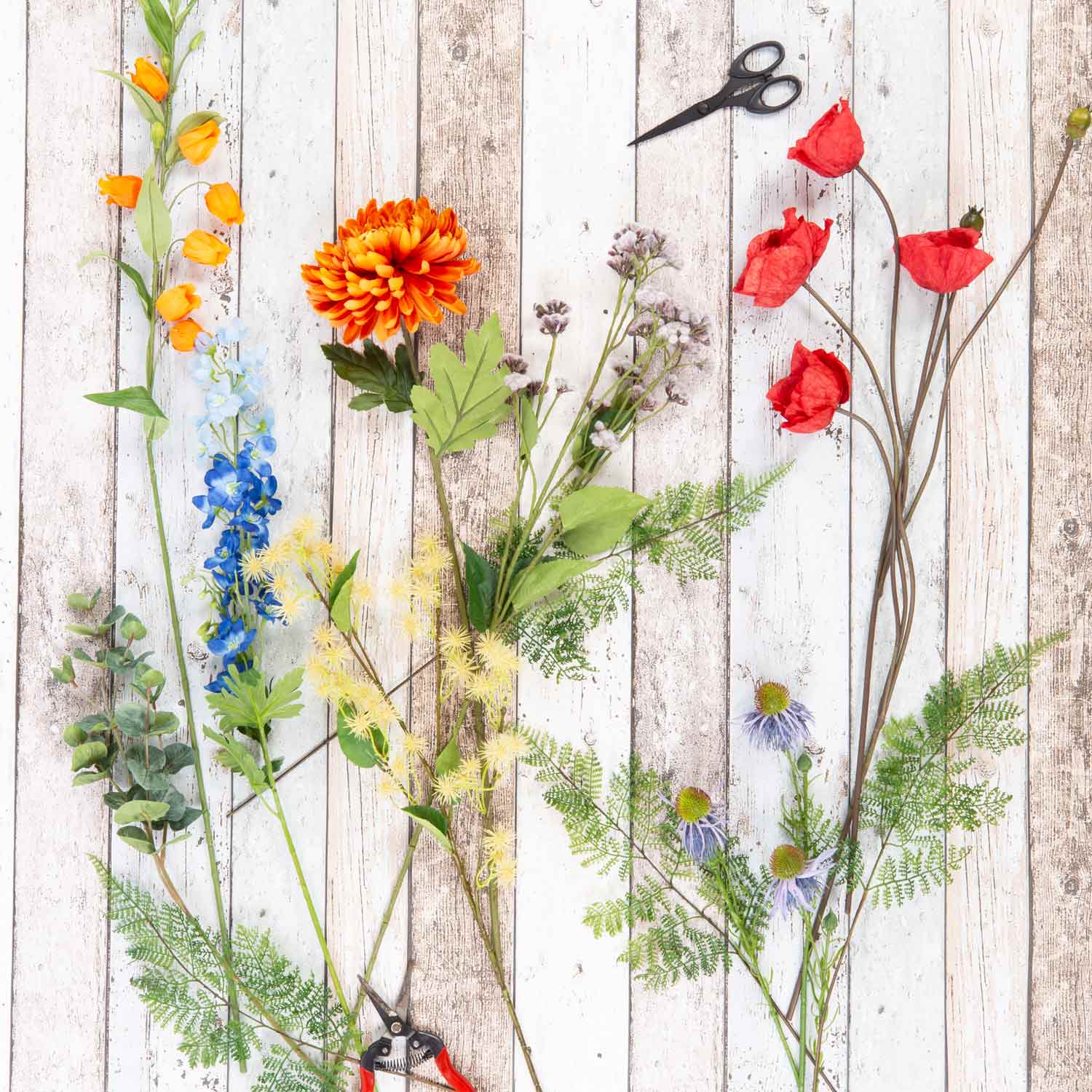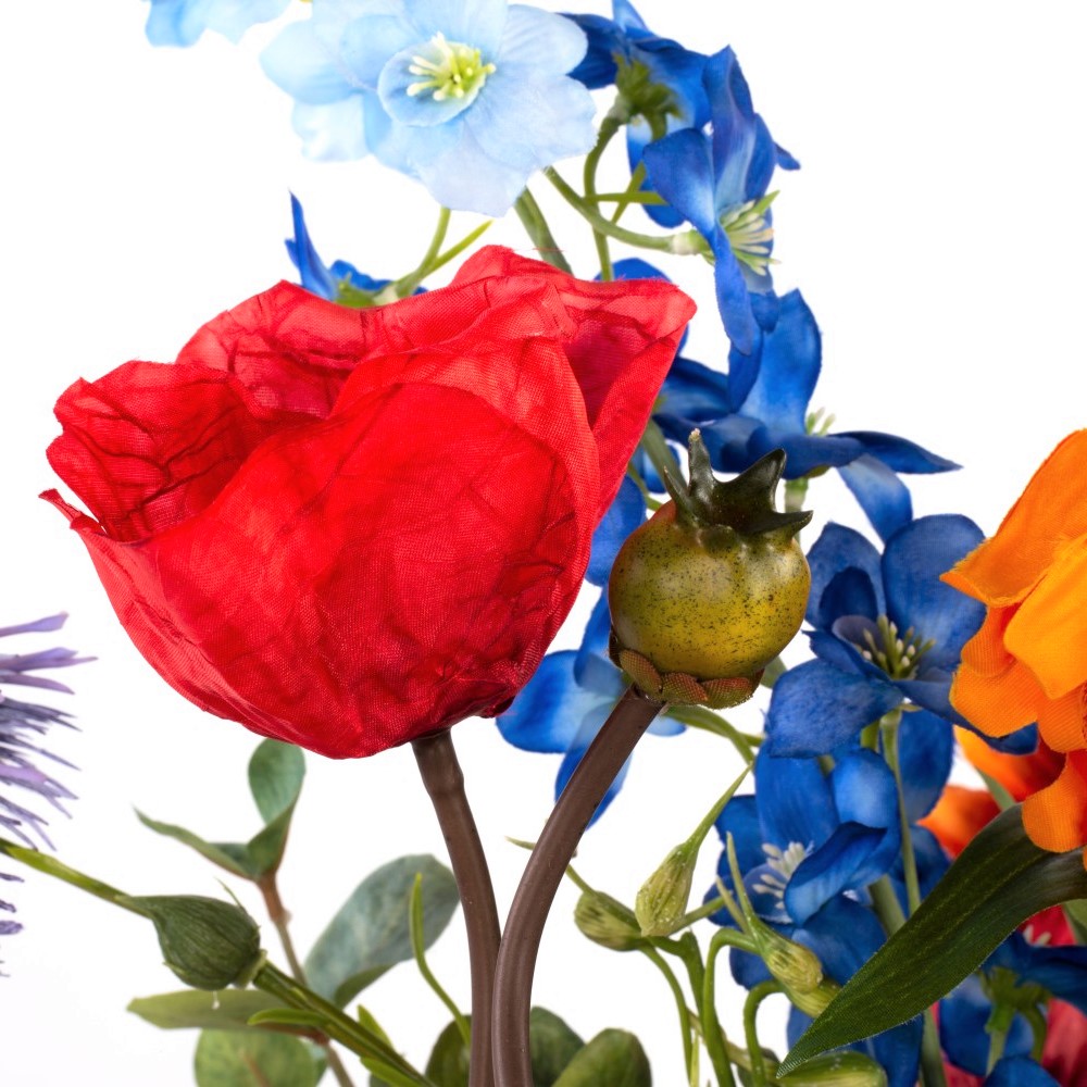 Este ramo de flores artificiales LOLANA es una encantadora forma de darle la bienvenida al verano. Junto a los exuberantes crisantemos, las juguetonas echinacea y las simpáticas amapolas, los delphinium y los lirios Sandersonia destacan en el conjunto floral. El ramo textil está enmarcado por eucaliptos y helechos de filigrana.