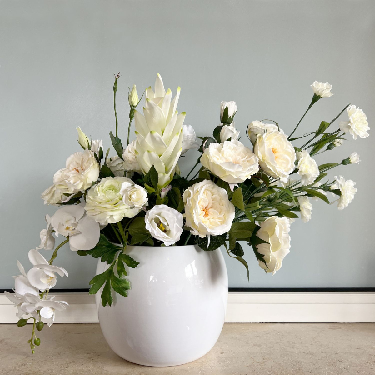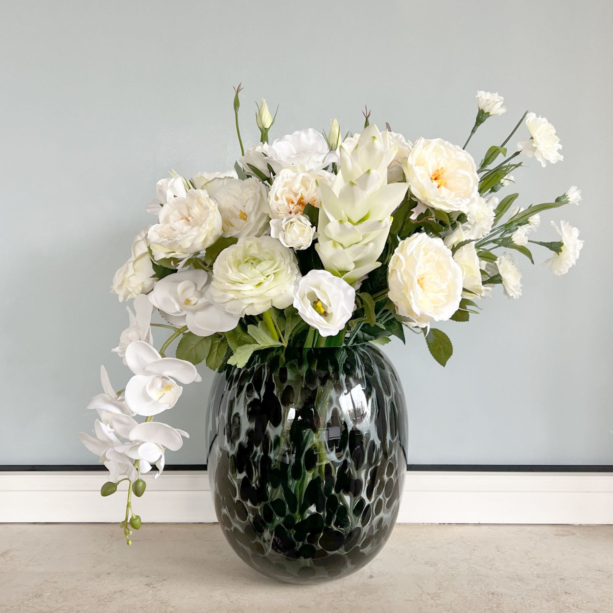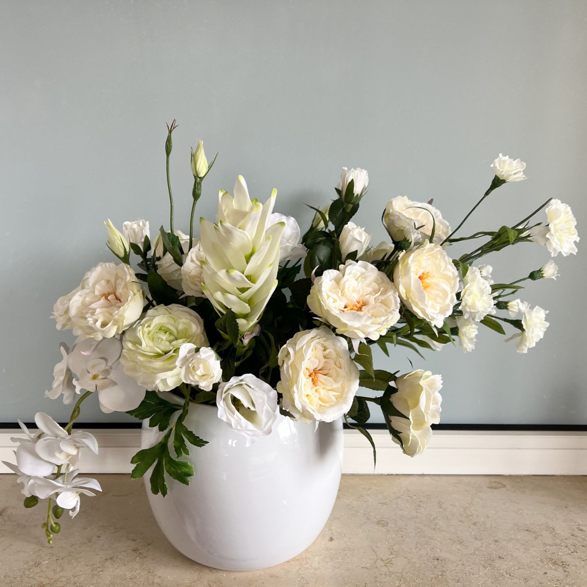 ¡Tentación floral! Ceren tenía una idea muy clara de cómo quería su ramo, pero no estaba segura de qué flores elegir ni de cómo darle forma, así que nos encargó el trabajo. La imagen que adjuntó a su mensaje nos ayudó a crear el ramo. Así fue como las rosas, los lisianthus y los ranúnculos acabaron formando parte del ramo. Para adornar los laterales del ramo, añadimos una rama de orquídeas colgante y claveles que sobresalían alegremente del ramo. El resultado fue un ramo lleno de flores blancas que la clienta encargó inmediatamente. ¿También quieres un ramo tan bonito? ¡Compra el look!