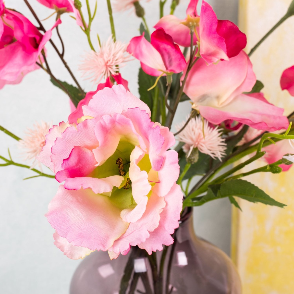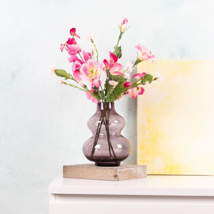 ¡Vacaciones de verano! Hace dos años tuvimos el placer de preparar un ramo de flores para Elisabeth. Esta vez quería un ramo pequeño para su autocaravana. Debido al llamativo colorido del jarrón, elegimos flores de un solo color, pero con flores especiales y originales. Este ramo de lisianthus, lathyrus y centáurea garantiza momentos inolvidables de bienestar durante las vacaciones de verano. ¡Compra el look!