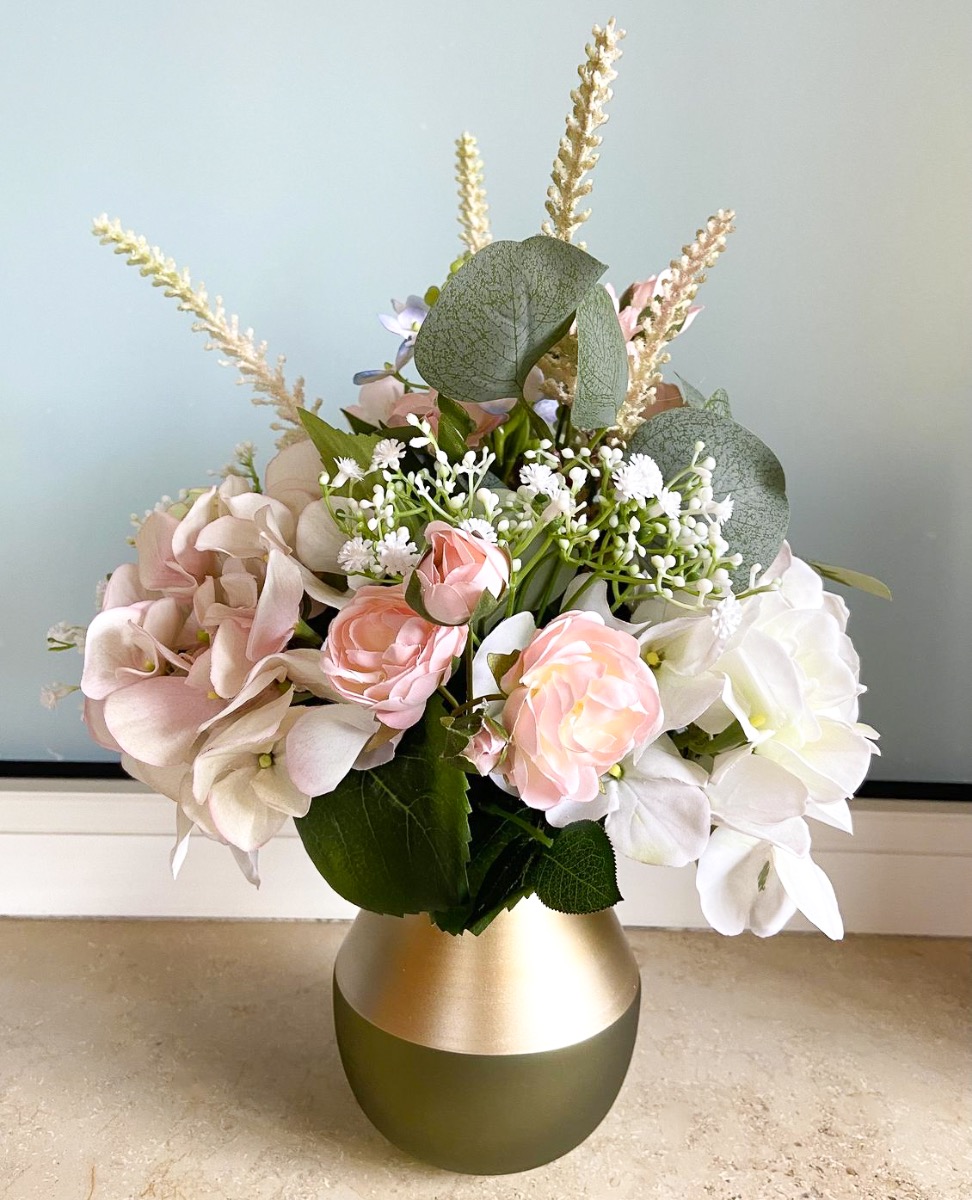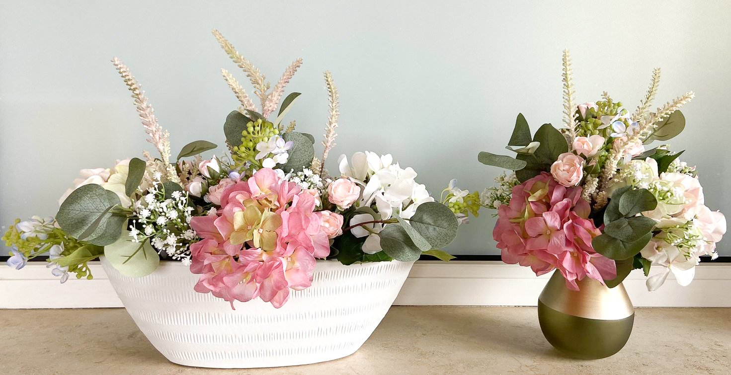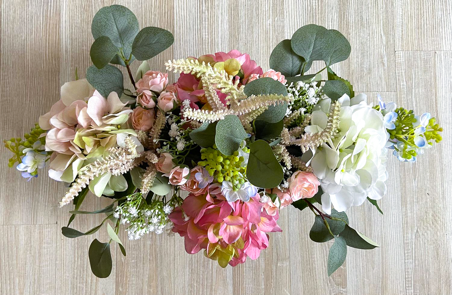 ¡Boda en un crucero! ¿A quién no le gustaría casarse en un paraíso vacacional o en alta mar? Para hacer realidad esta experiencia, una compañía de cruceros nos encargó la decoración con flores artificiales. Cuando viajan por regiones sin suministro de flores frescas. Para la mesa nupcial se necesitaban dos ramos de novia de aspecto diferente con arreglos de mesa a juego. Como punto de referencia, el cliente nos dijo que le habían gustado las dos peticiones de clientes realizadas anteriormente "Arreglo exclusivo de hortensias - petición del cliente Hans Peter" y "Ramo y alfiler de novia exclusivos - petición del cliente Elisabeth". Volvimos a realizar estos dos looks en rosa como ramo de novia pequeño y también diseñamos una versión moderna en blanco. La decisión se tomó a favor de la petición del cliente "Arreglo exclusivo de hortensias - petición del cliente Hans Peter" como versión modificada del ramo de novia y nuestro ramo de novia blanco de nueva creación. Para la versión rosa, también creamos un arreglo adicional en un cuenco ovalado con exactamente las mismas flores y el ramo blanco también recibió un arreglo a juego en un cuenco redondo. Los dos ramos de novia se remataron con una cinta blanca alrededor de los tallos para que resultaran cómodos de sostener en las manos de las novias. Como se permitió equipar dos cruceros con las flores artificiales, lo enviamos todo a la naviera en un paquete doble, desde donde nuestras flores viajan ahora por todo el mundo. ¿A ti también te gustaría un conjunto floral tan bonito? ¡Compra el look!