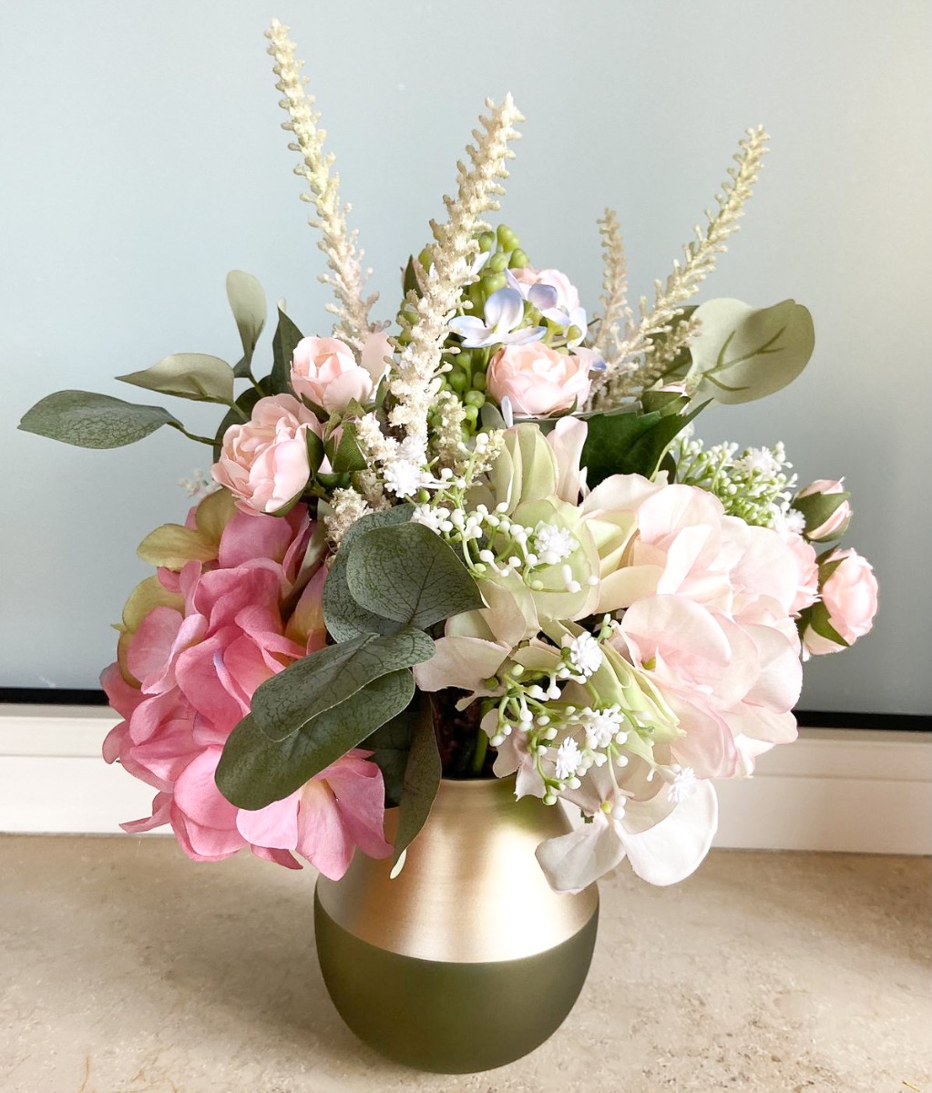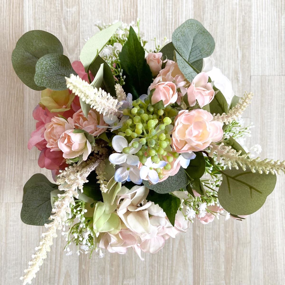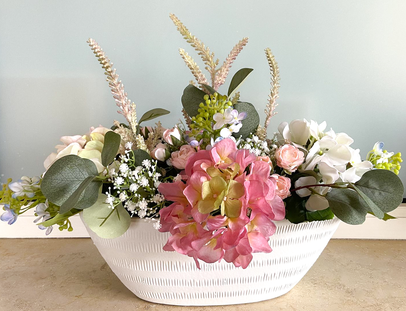 ¡Boda en un crucero! ¿A quién no le gustaría casarse en un paraíso vacacional o en alta mar? Para hacer realidad esta experiencia, una compañía de cruceros nos encargó la decoración con flores artificiales. Cuando viajan por regiones sin suministro de flores frescas. Para la mesa nupcial se necesitaban dos ramos de novia de aspecto diferente con arreglos de mesa a juego. Como punto de referencia, el cliente nos dijo que le habían gustado las dos peticiones de clientes realizadas anteriormente "Arreglo exclusivo de hortensias - petición del cliente Hans Peter" y "Ramo y alfiler de novia exclusivos - petición del cliente Elisabeth". Volvimos a realizar estos dos looks en rosa como ramo de novia pequeño y también diseñamos una versión moderna en blanco. La decisión se tomó a favor de la petición del cliente "Arreglo exclusivo de hortensias - petición del cliente Hans Peter" como versión modificada del ramo de novia y nuestro ramo de novia blanco de nueva creación. Para la versión rosa, también creamos un arreglo adicional en un cuenco ovalado con exactamente las mismas flores y el ramo blanco también recibió un arreglo a juego en un cuenco redondo. Los dos ramos de novia se remataron con una cinta blanca alrededor de los tallos para que resultaran cómodos de sostener en las manos de las novias. Como se permitió equipar dos cruceros con las flores artificiales, lo enviamos todo a la naviera en un paquete doble, desde donde nuestras flores viajan ahora por todo el mundo. ¿A ti también te gustaría un conjunto floral tan bonito? ¡Compra el look!
