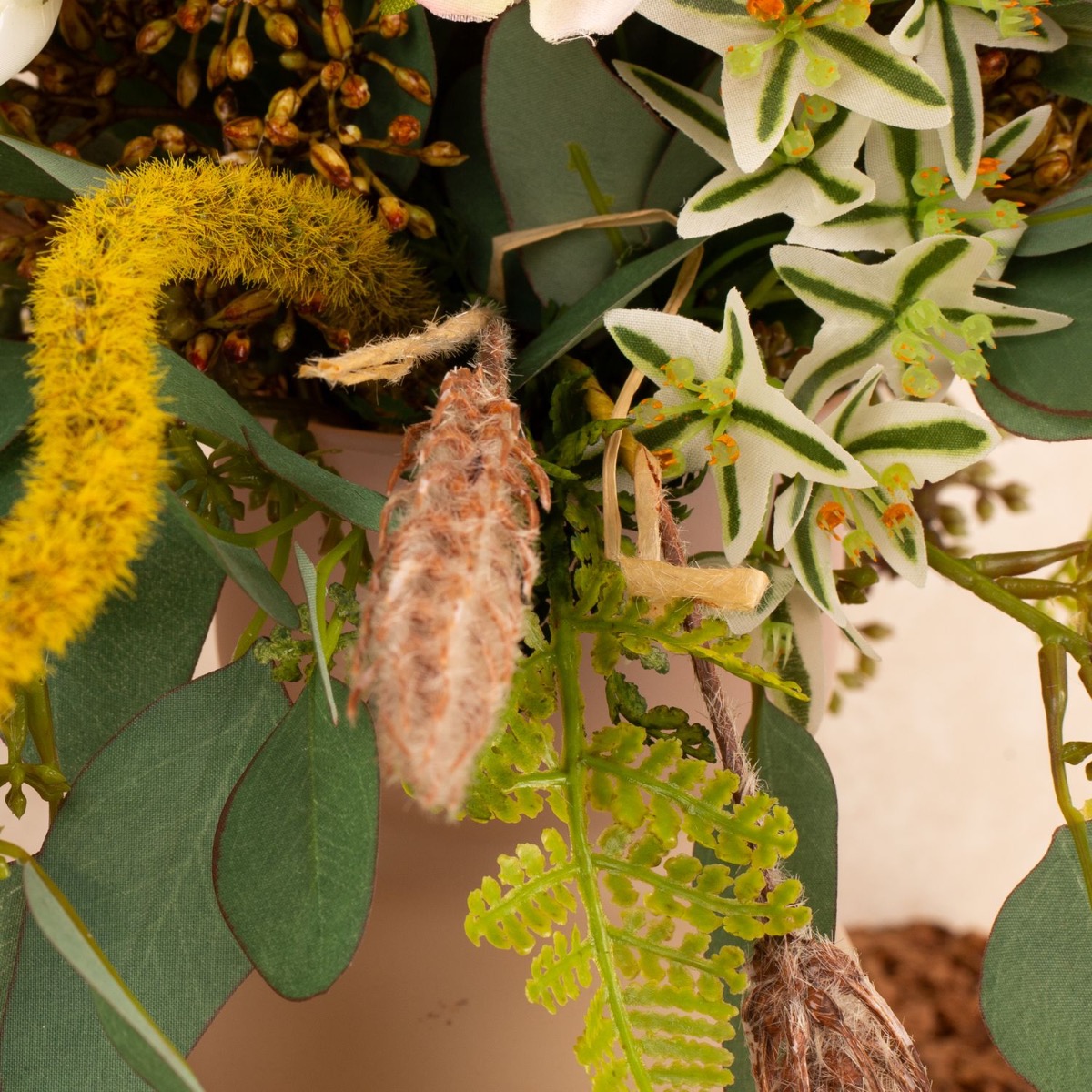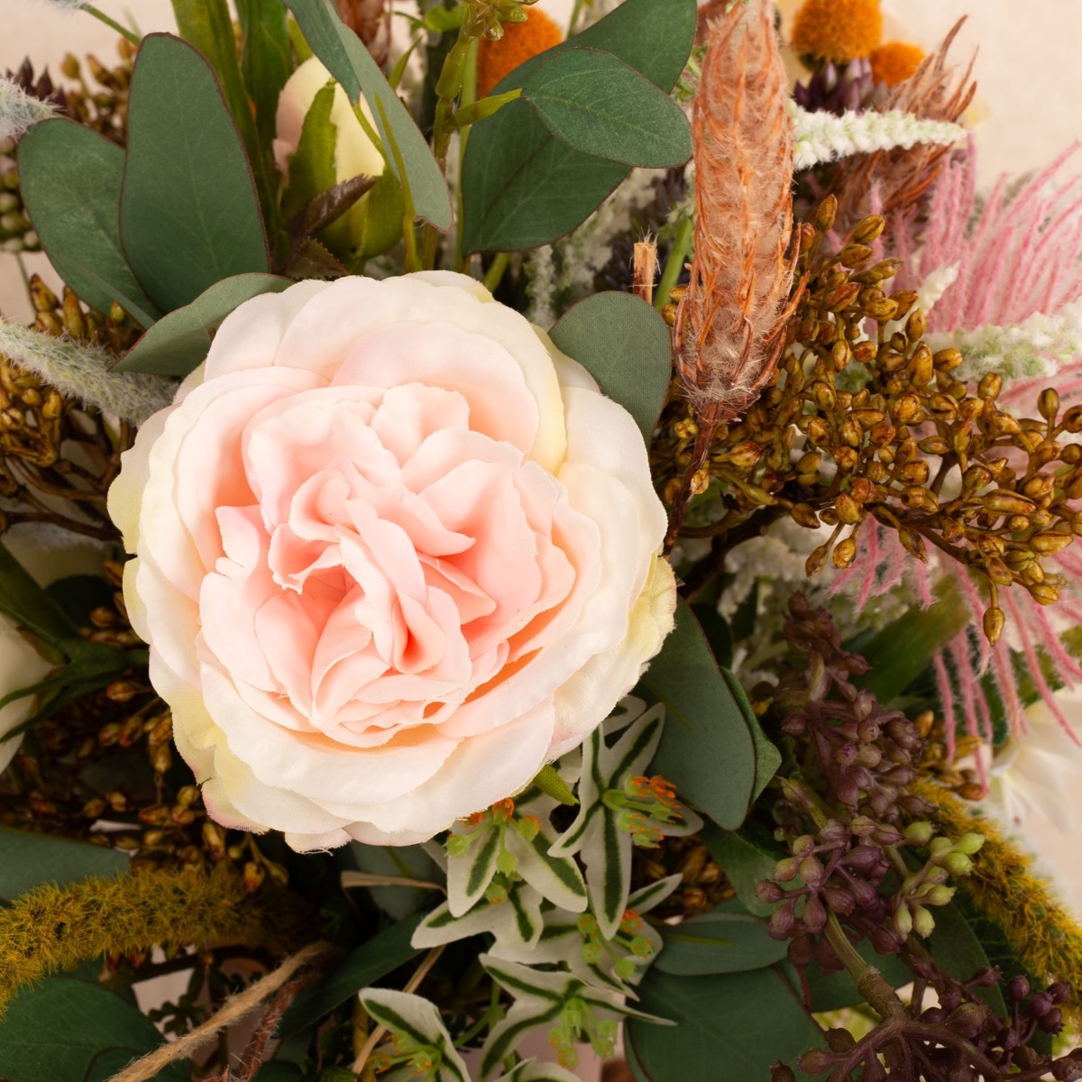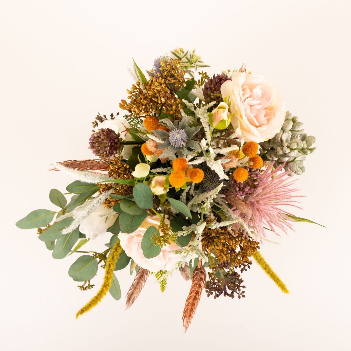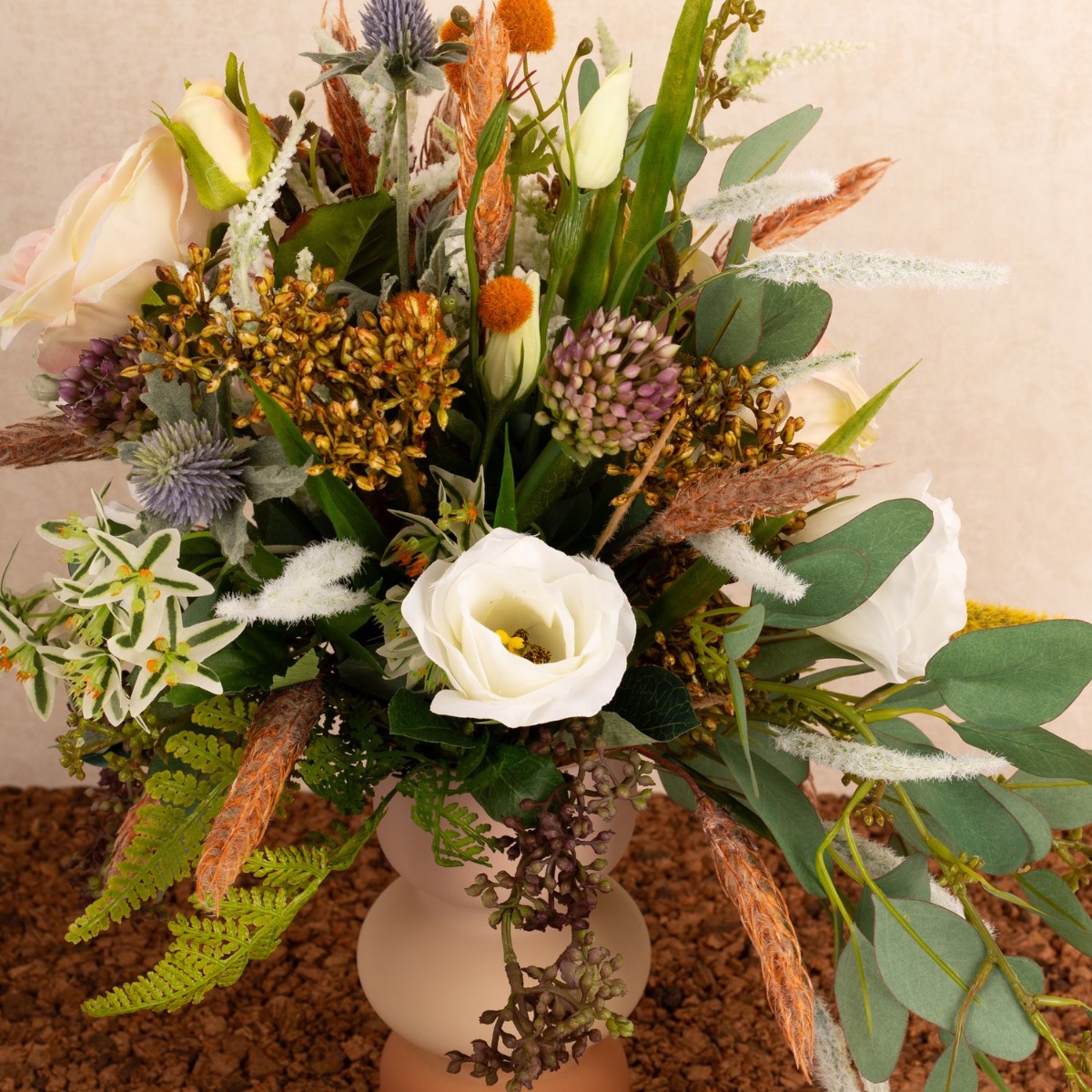 ¡Conjunto floral salvaje y romántico! Kate quería que creáramos una réplica artificial de su ramo de novia como recuerdo. Estábamos encantados con su encargo, un delicado ramo de flores silvestres, cuidadosamente atado por un florista. Tras una larga búsqueda, pudimos reunir las innumerables flores del ramo y ponernos manos a la obra. Cortamos numerosas ramas e incluso tuvimos que hacer un tallo alargado para la suculenta del ramo. A continuación, se insertaron numerosas panículas en el ramo y se creó un saliente de eucalipto. El ramo de novia casi se parecía al ramo de novia original, de lo que nuestra clienta también se dio cuenta con asombro. ¿Te gustaría a ti también recibir un ramo de novia tan bonito? ¡Compra el look!
