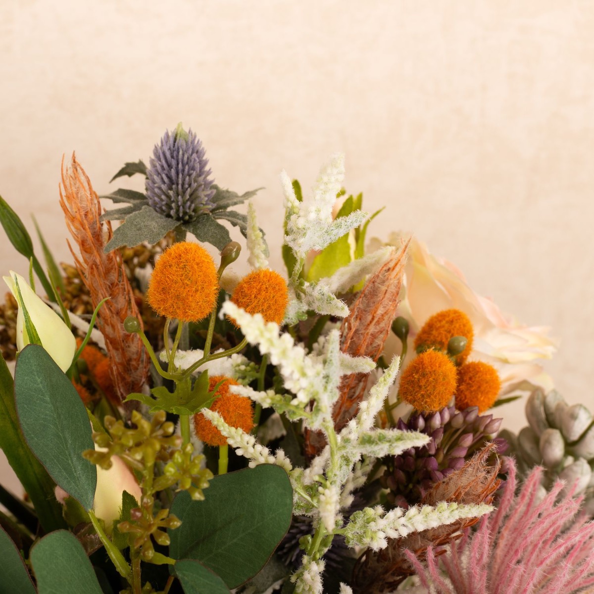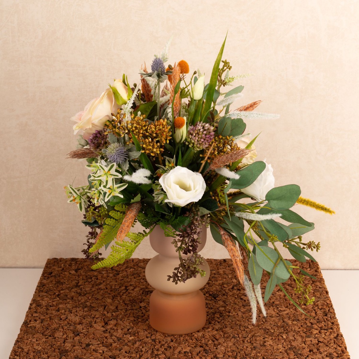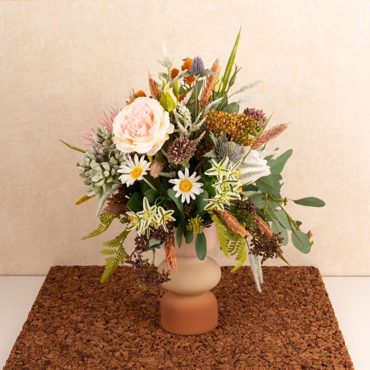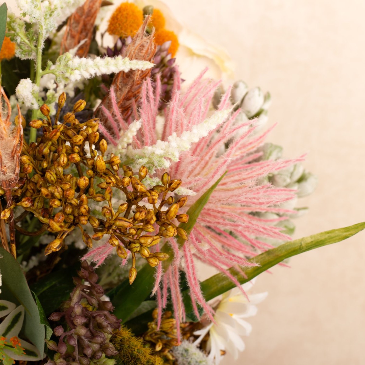 ¡Conjunto floral salvaje y romántico! Kate quería que creáramos una réplica artificial de su ramo de novia como recuerdo. Estábamos encantados con su encargo, un delicado ramo de flores silvestres, cuidadosamente atado por un florista. Tras una larga búsqueda, pudimos reunir las innumerables flores del ramo y ponernos manos a la obra. Cortamos numerosas ramas e incluso tuvimos que hacer un tallo alargado para la suculenta del ramo. A continuación, se insertaron numerosas panículas en el ramo y se creó un saliente de eucalipto. El ramo de novia casi se parecía al ramo de novia original, de lo que nuestra clienta también se dio cuenta con asombro. ¿Te gustaría a ti también recibir un ramo de novia tan bonito? ¡Compra el look!
