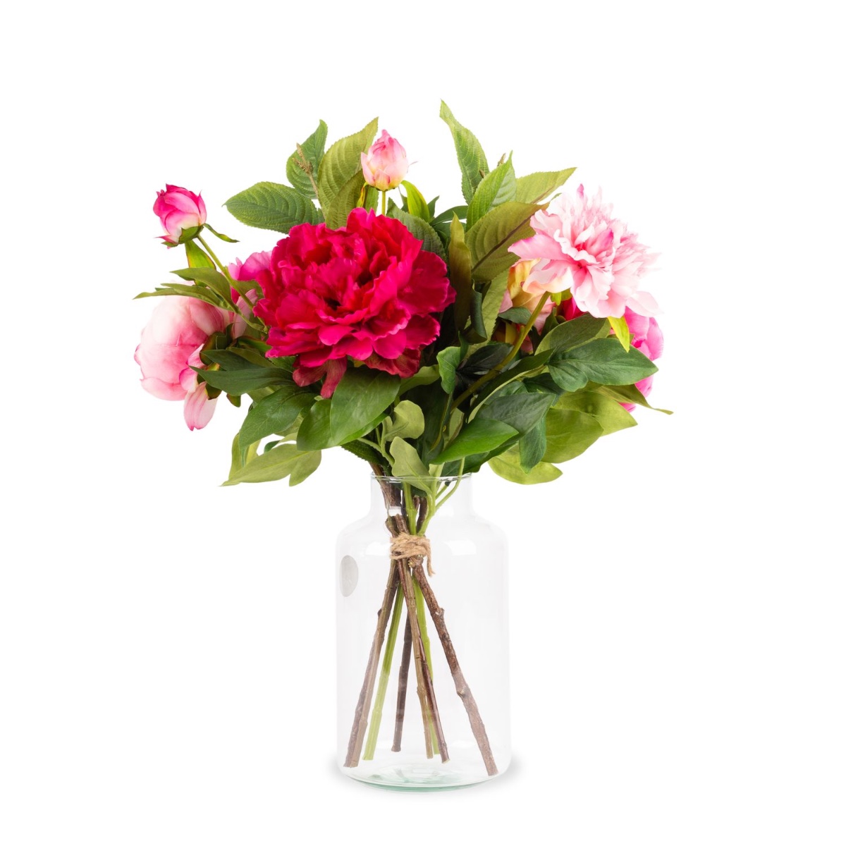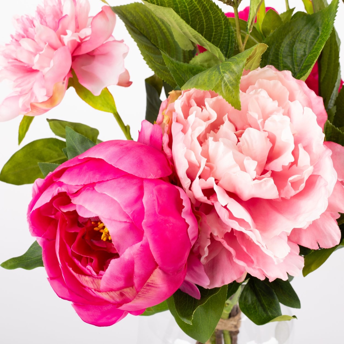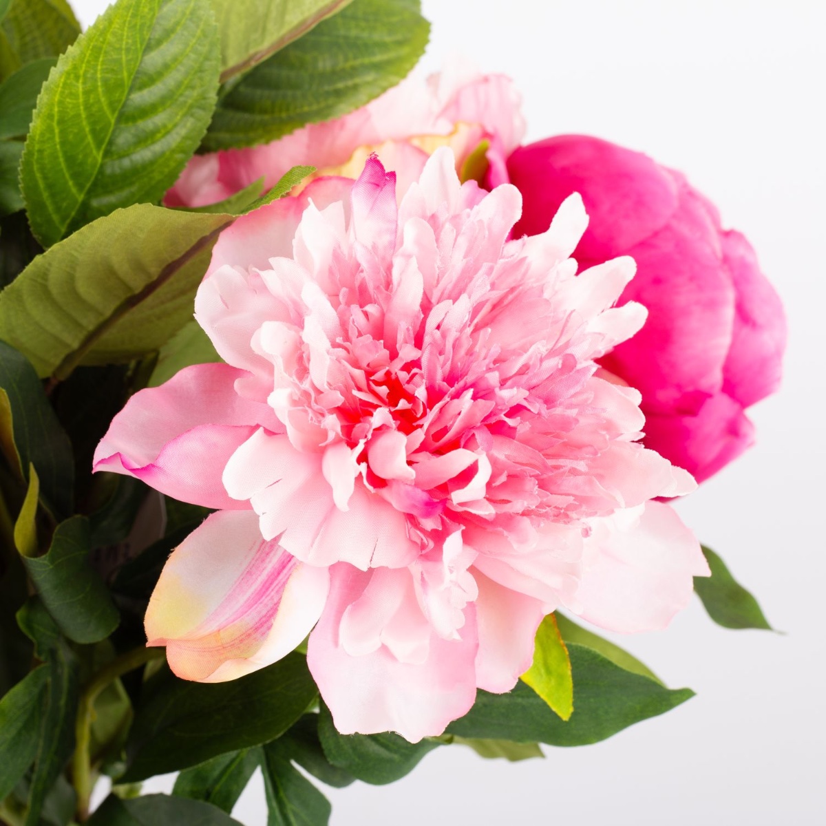 Del fucsia al rosa pálido. Las peonías, con sus flores llenas y exuberantes, muestran casi todos los tonos de rosa, desde el rosa oscuro hasta el rosa claro. Esta flor tan veraniega encaja perfectamente en la estación y aporta un toque de color fresco a la habitación. Este ramo de peonías parece tan real que parece recién recogido del jardín. Hay que tocarlas para darse cuenta de que son flores artificiales de alta calidad hechas de tela.