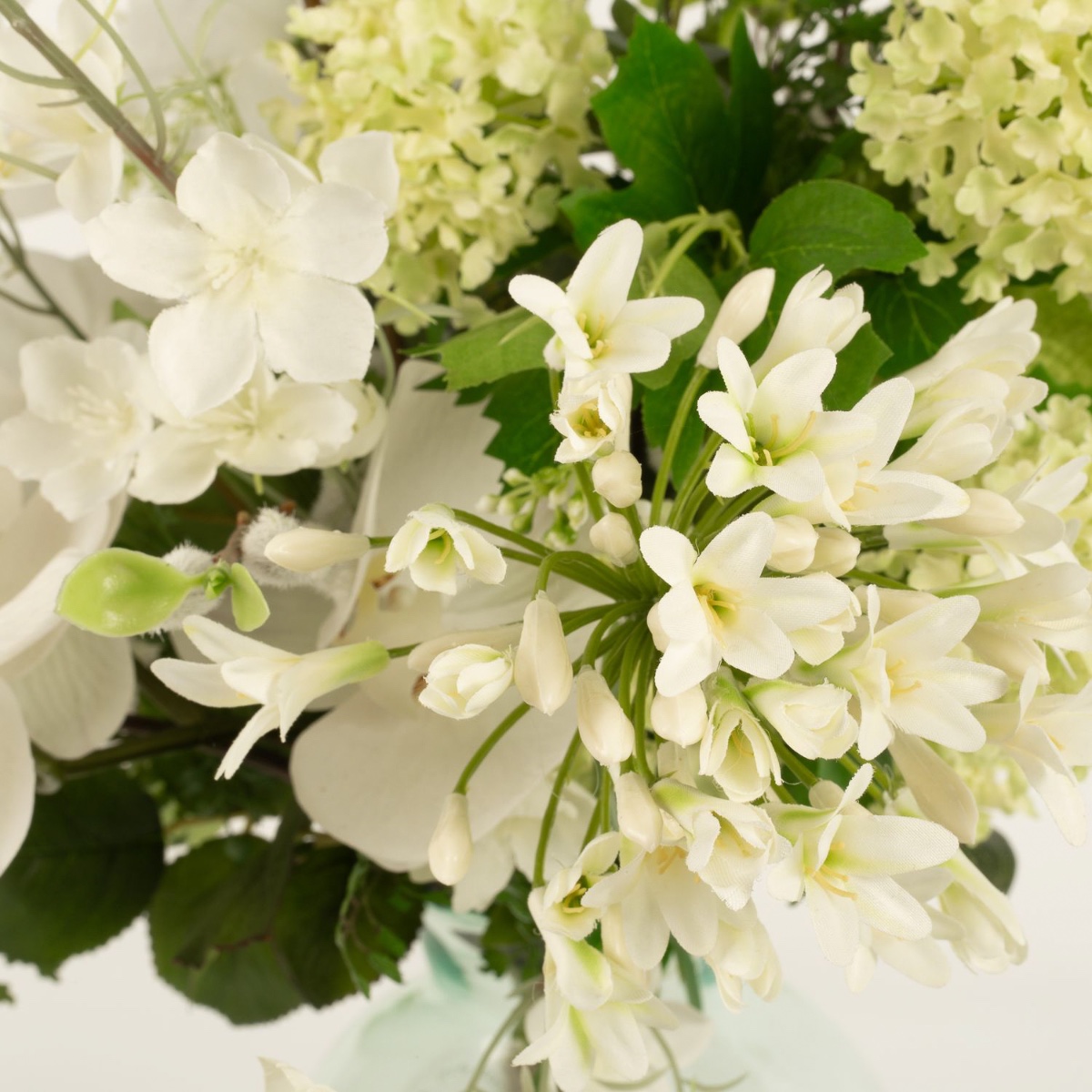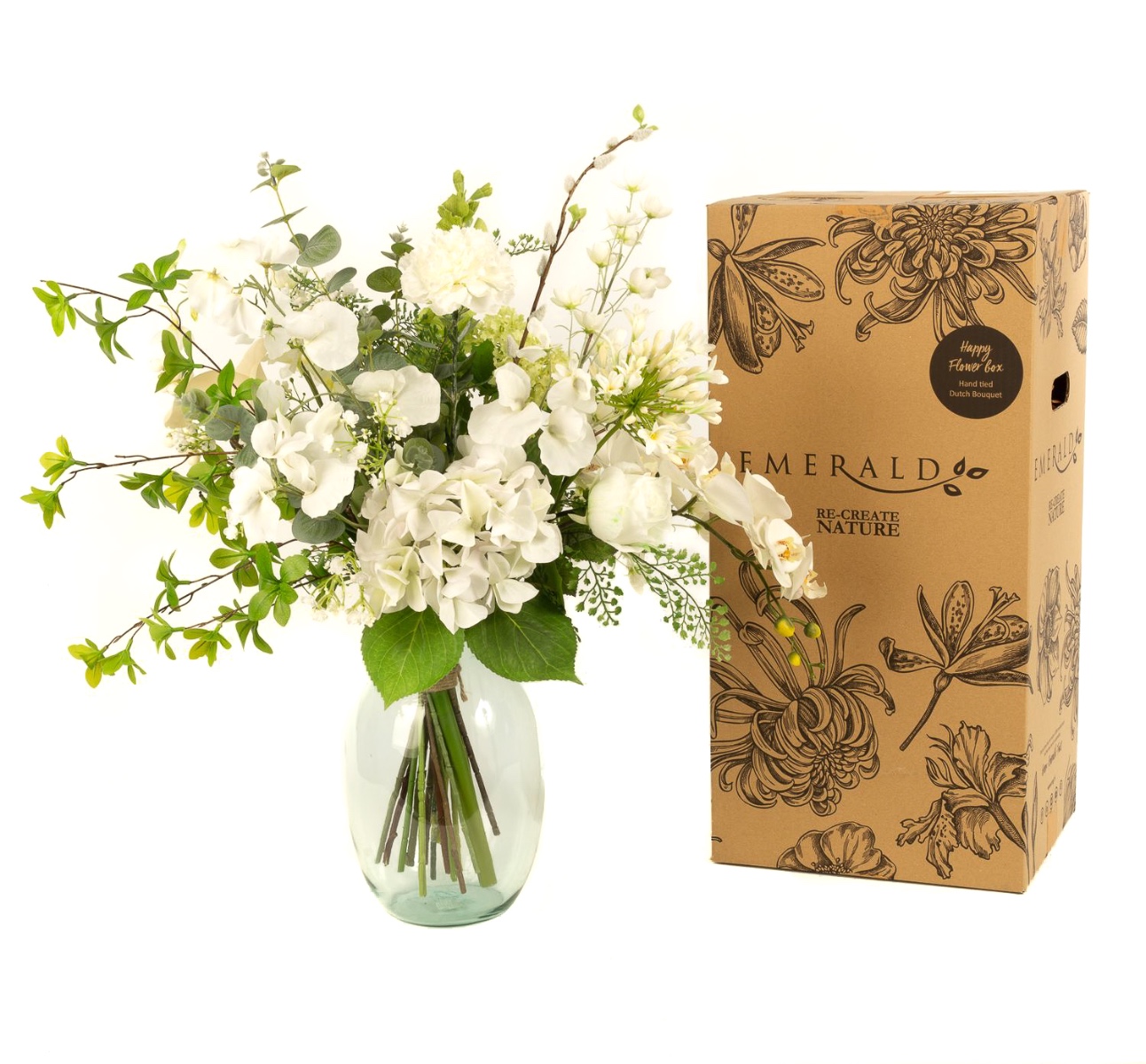 Blanco como la nieve y verde como la esperanza. Una vez superados los calurosos días de verano, muchos esperan con ilusión la llegada del frío, la nieve y el ambiente navideño. Un ramo que parece una preciosa nevada es perfecto para ello. Las flores blancas, como las hortensias, las viburnas, los claveles y las orquídeas, crean un ambiente invernal mágico y combinan con todo.