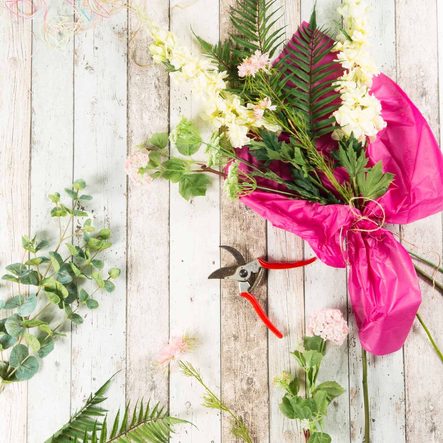 - Las flores y las ramas se pueden acortar individualmente o, después de quitar el cordel, también se pueden utilizar individualmente para proyectos creativos