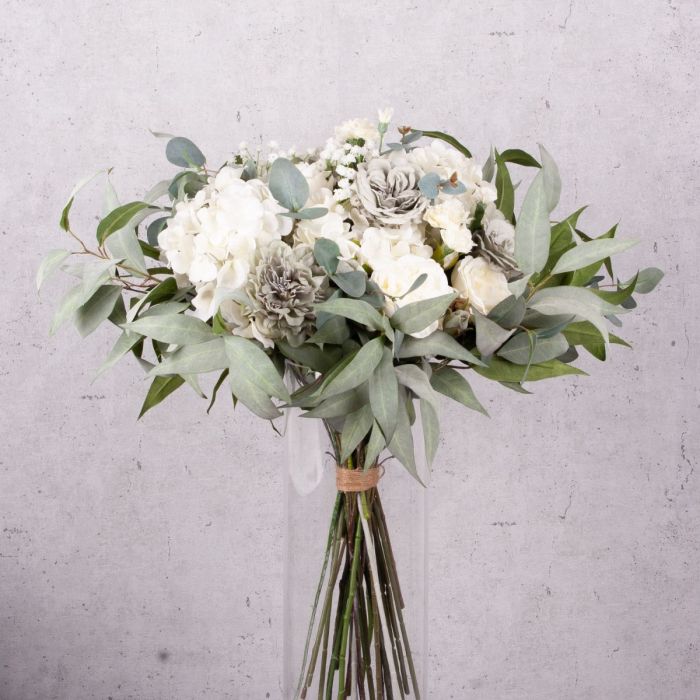¡Elegante y delicado! Este ramo es discreto y comedido en sus colores. Así es exactamente como se lo imaginó nuestra clienta de Francia, de quien habíamos recibido una solicitud de ramo personalizado. El verde pálido de las hojas de eucalipto, combinado con las rosas repollo grises y las hortensias blancas, confieren al ramo un aspecto otoñal y melancólico. Los colores discretos hacen que este ramo sea adecuado para casi cualquier habitación. ¿Te gustaría también un ramo artificial extravagante? ¡Compra el look!