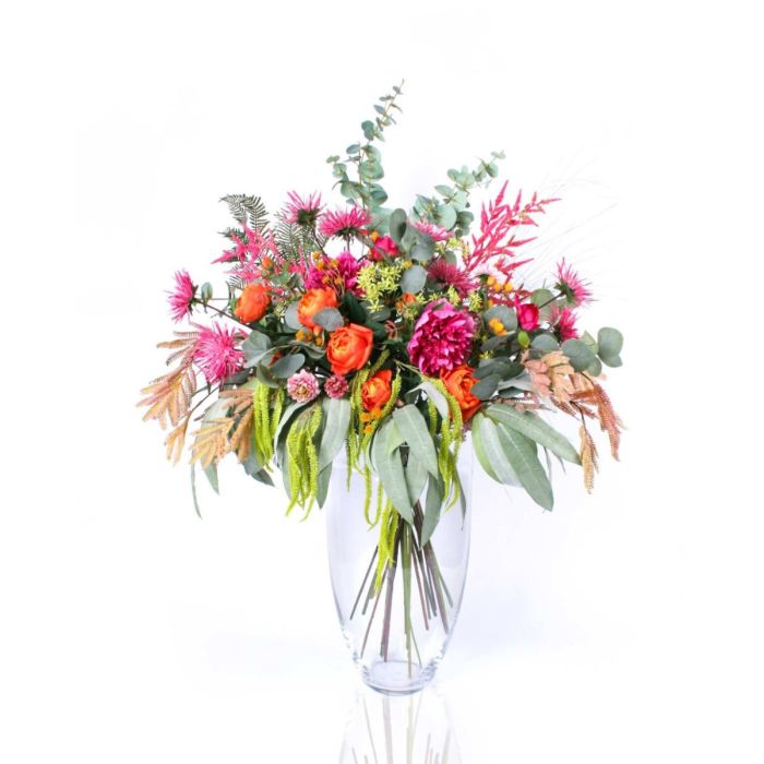 ¡Ramo artificial de colores! Natali nos envió un correo electrónico y nos preguntó si también podríamos recrear ramos de flores si nos enviaba una foto de ellos. Por supuesto, respondimos afirmativamente. En el siguiente mensaje de Natali, recibimos una foto del ramo que quería, que había visto por casualidad en un restaurante. Un ramo romántico y juguetón en tonos rosas y amarillos. Le gustaba mucho la abundancia y el estilo del ramo, pero quería que su ramo, que debería encontrar un lugar en su nuevo piso, fuera de color fucsia con un poco de naranja para armonizar con el nuevo mobiliario. Después de 2 horas de búsqueda en nuestra tienda y en el almacén, habíamos encontrado las flores adecuadas. El primer ejemplar fue bastante exitoso a la primera, pero aún faltaba un poco de verde fresco para darle al ramo un toque veraniego brillante. Las ramitas a juego cayeron en nuestras manos por casualidad en el almacén. Añadimos las ramitas al ramo y distribuimos el verde entre las coloridas flores y el ramo fue un éxito total. A nuestro cliente le gustó el ramo de inmediato, lo que nos hizo muy felices. Por supuesto, no queríamos privar a nuestros otros clientes de este hermoso ramo, así que elegimos un jarrón a juego. ¿También quiere dar un nuevo brillo a su espacio vital? ¡Compre el look!