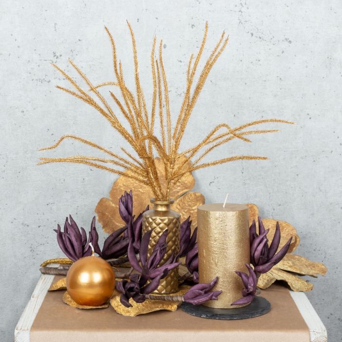 Violeta y dorado! Una combinación de colores atmosférica que va especialmente bien en invierno. Cuando hace frío fuera, quieres aportar calidez a tu hogar. Los cálidos tonos dorados son especialmente adecuados en este caso, ya que también crean un ambiente festivo para la próxima temporada navideña. Las flores artificiales de color morado destacan entre los adornos de la mesa y juegan con los elementos dorados de la misma. Encante a sus invitados con esta magnífica decoración. Compra el look!