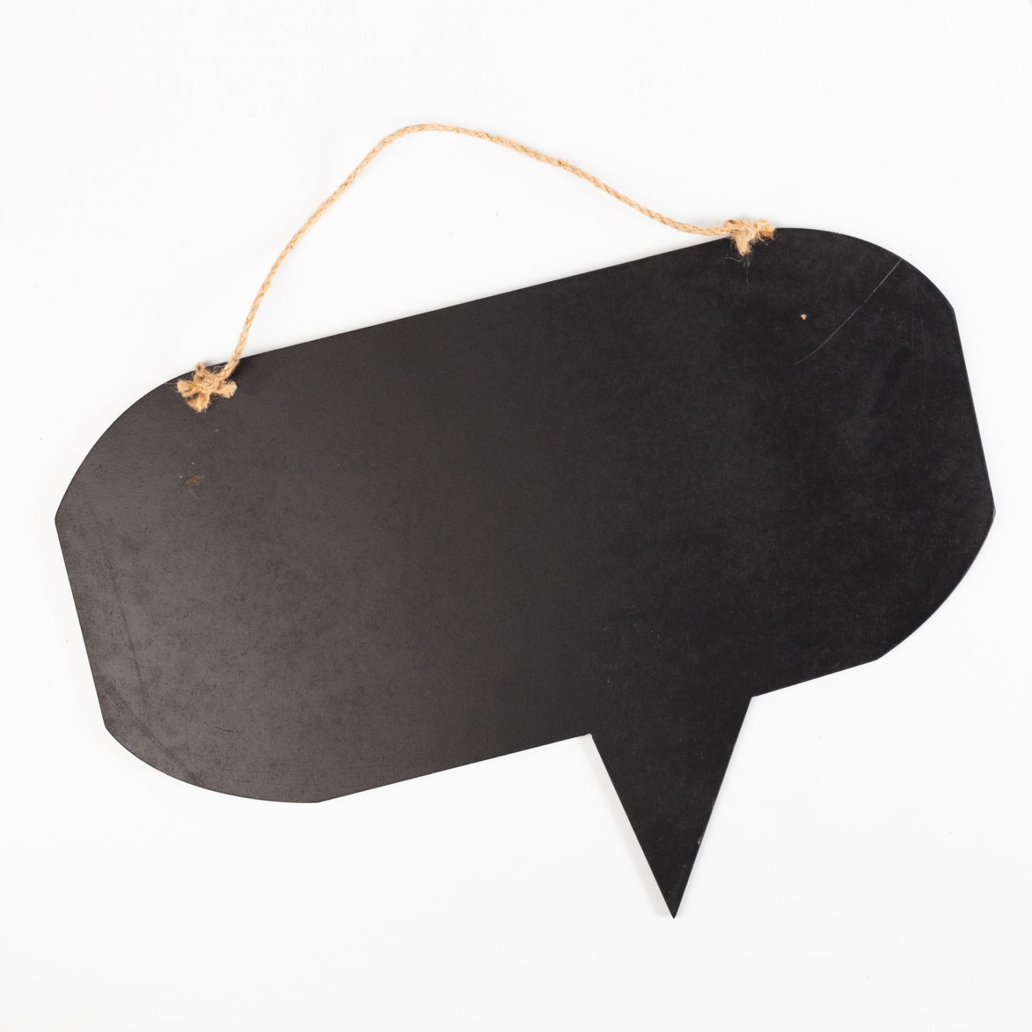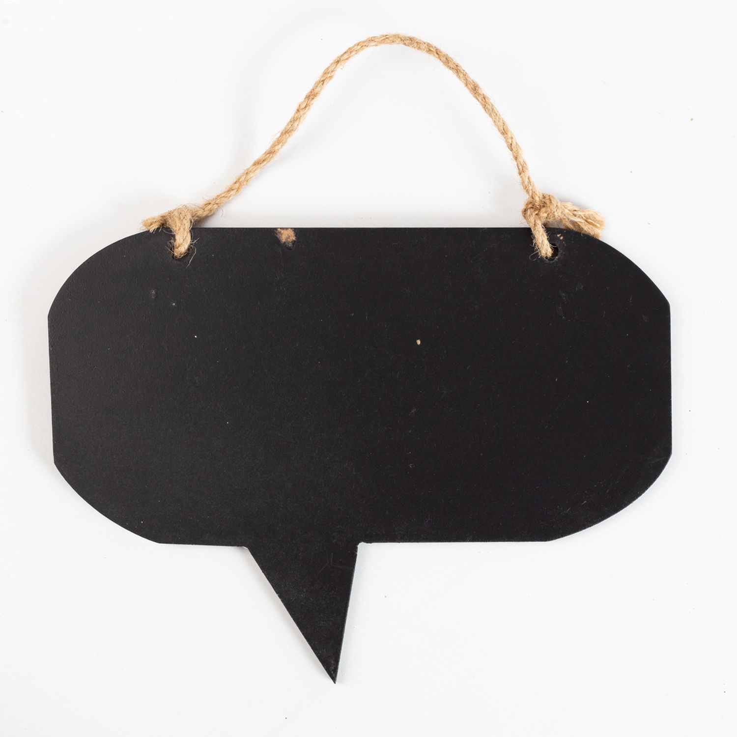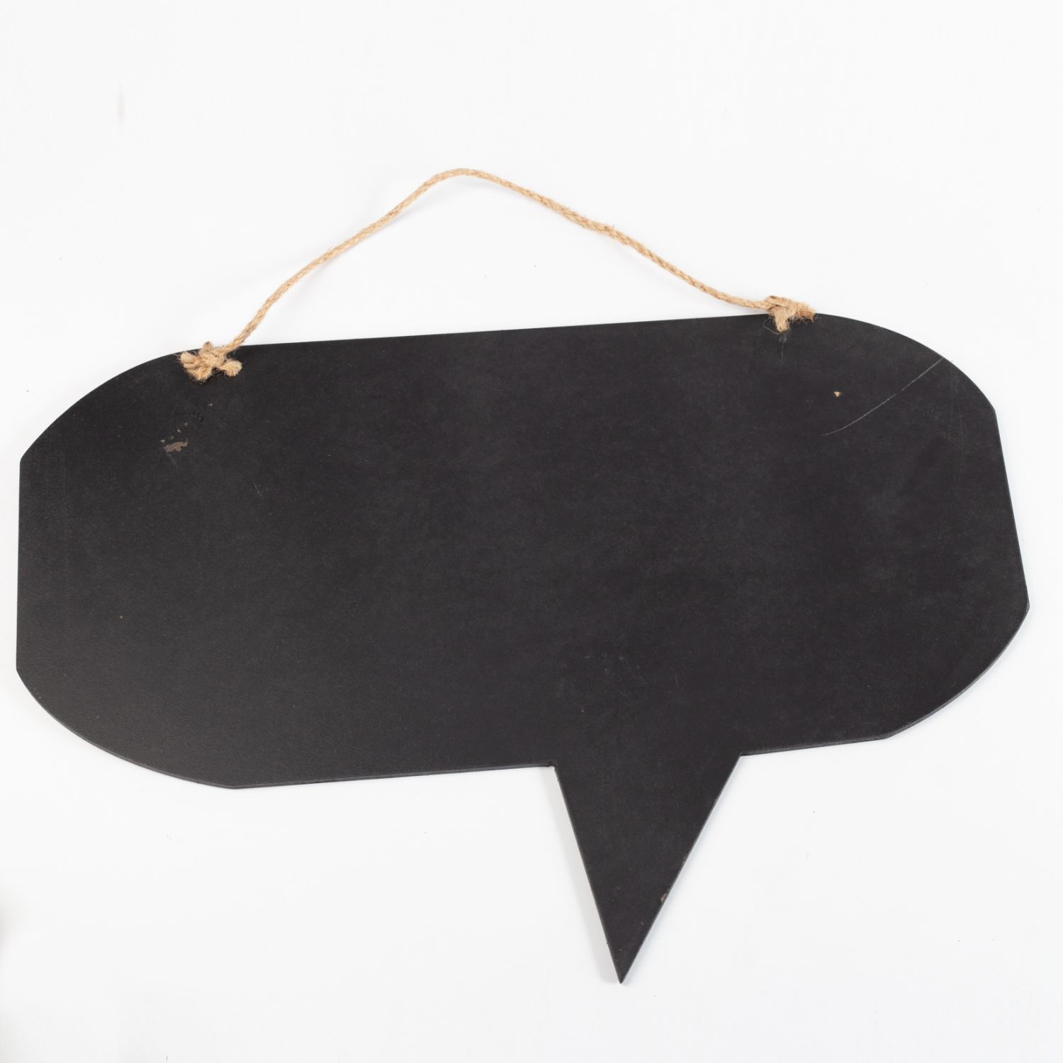 Recubierto con barniz de pizarra en el diseño de una burbuja de discurso, con cuerda de yute para colgar. En la pizarra se puede escribir con tiza de pizarra o con rotuladores de tiza.