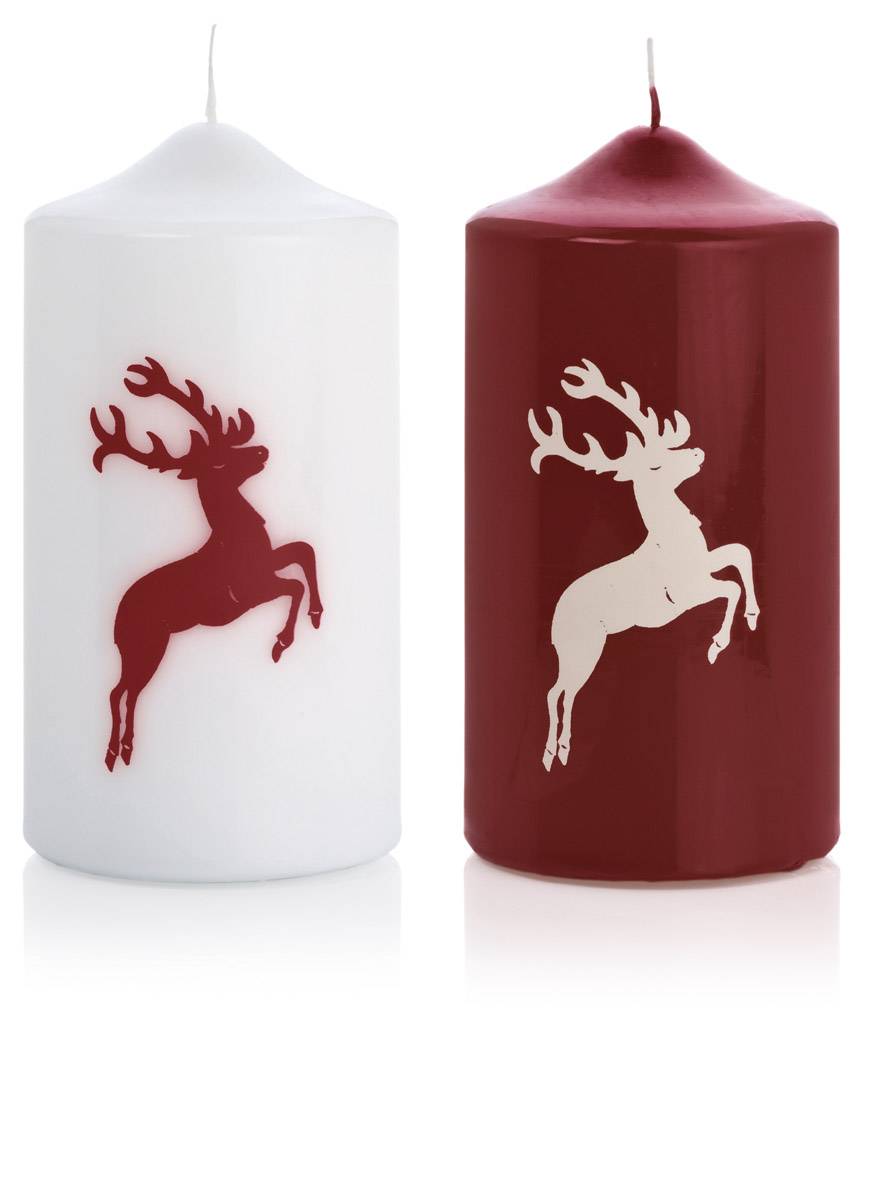 Vela con motivos / Vela de Navidad DALDI, dibujo de reno, conjunto de 2, burdeos, 15cm, Ø8cm, 69h - Hecho en Alemania