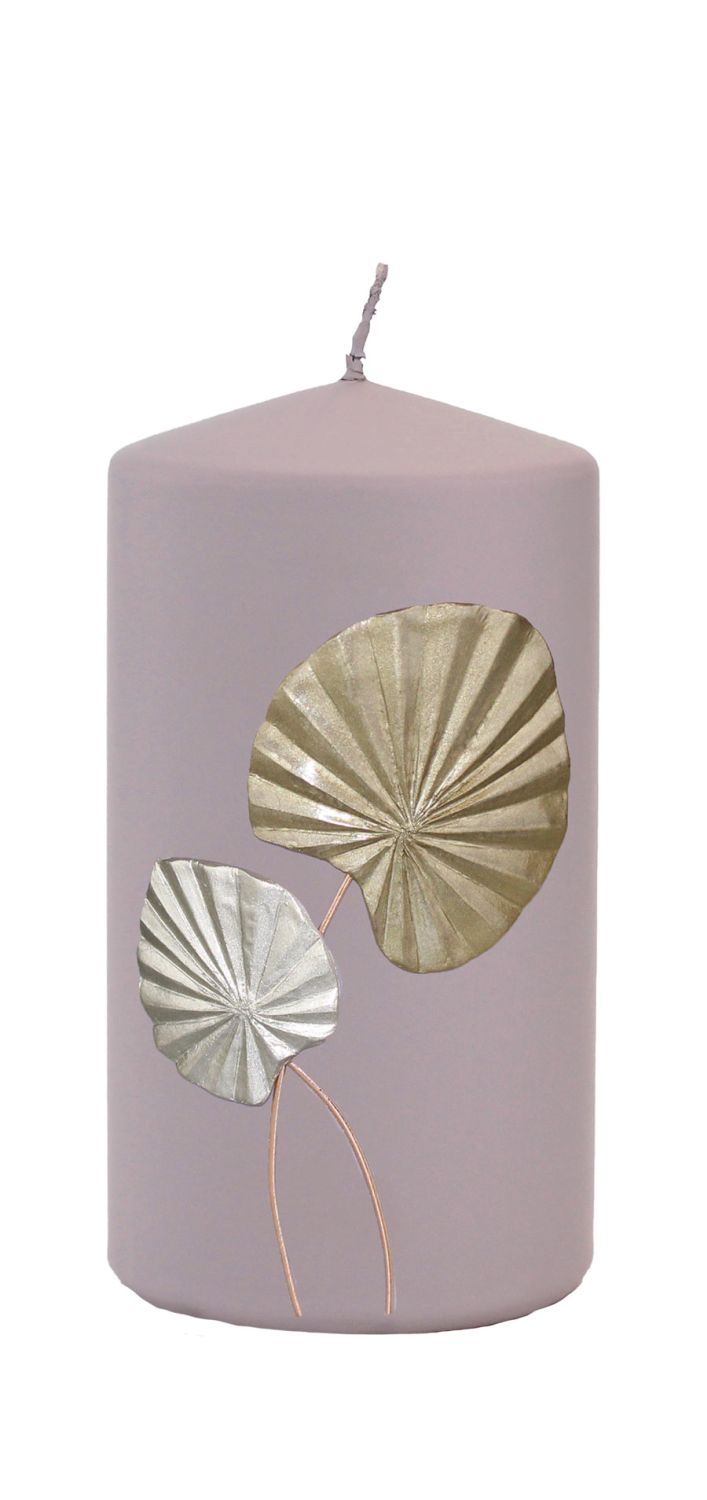 Vela pilar LLUVIA con motivo de hoja de palma, malva, 13cm, Ø7cm, 52h