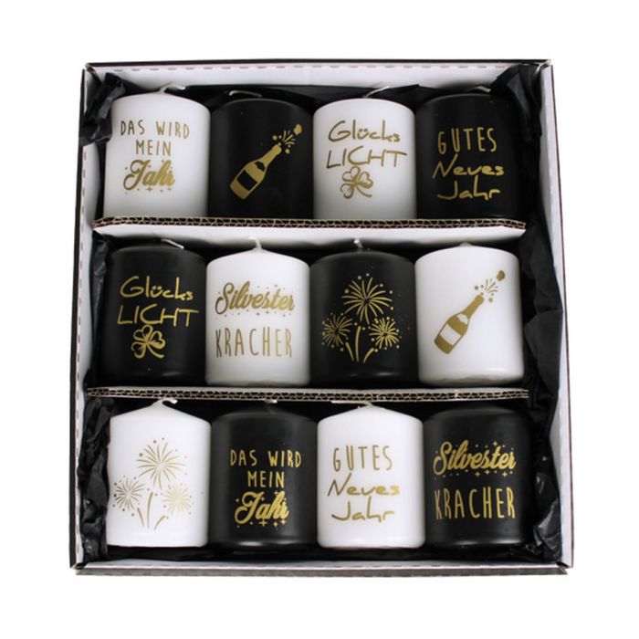 Velas de Nochevieja OVILA, 12 piezas, negro-blanco-oro, 8cm, Ø6cm - Made in Germany